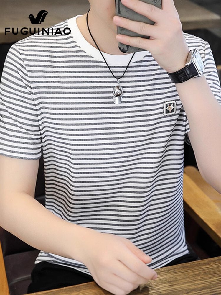 富贵鸟条纹短袖t恤男士冰丝凉感上衣夏季新款休闲圆领体恤男