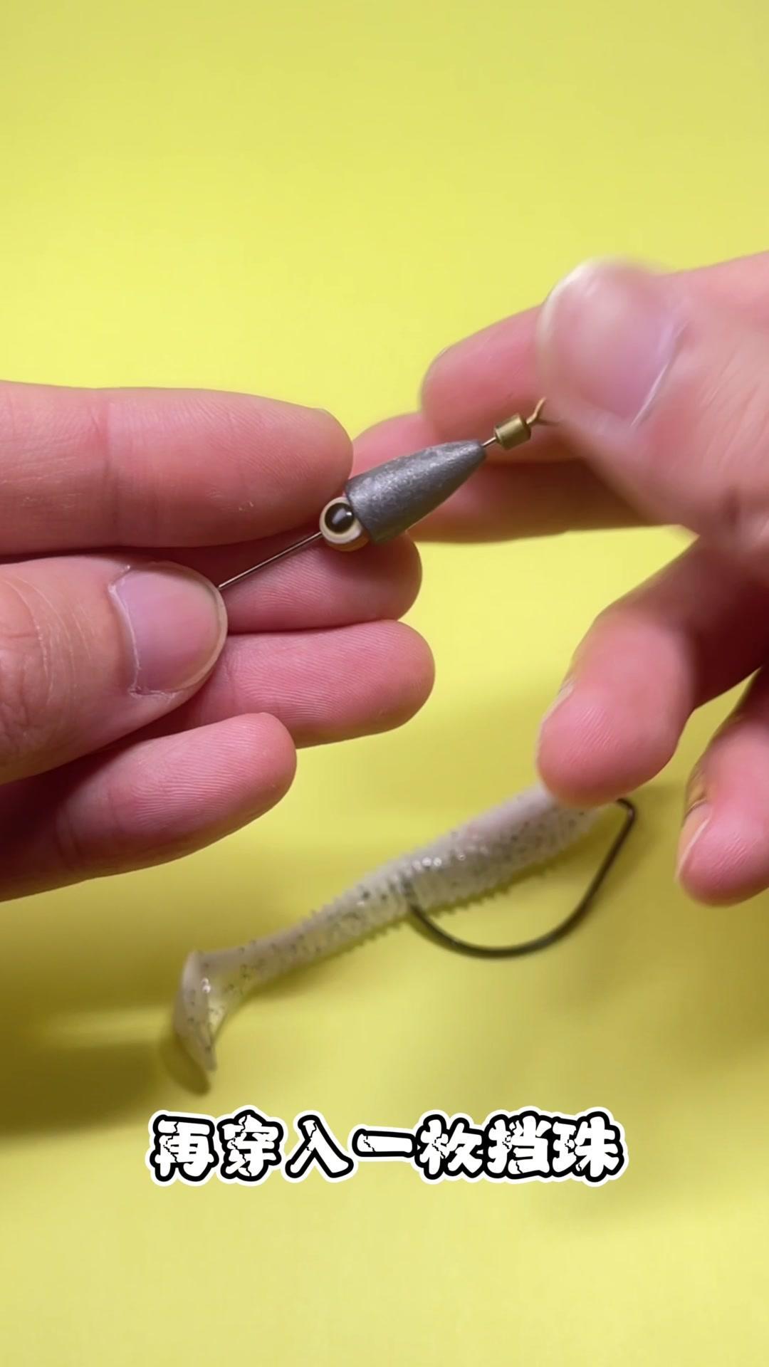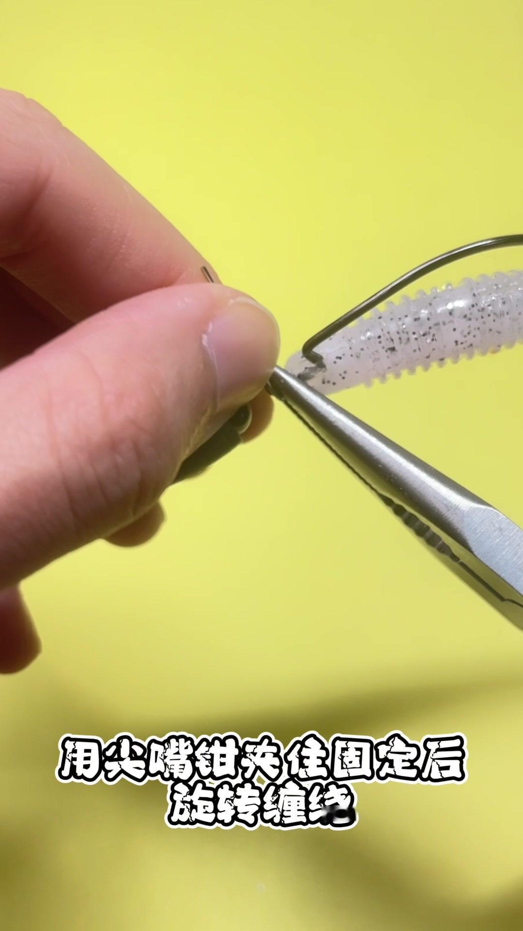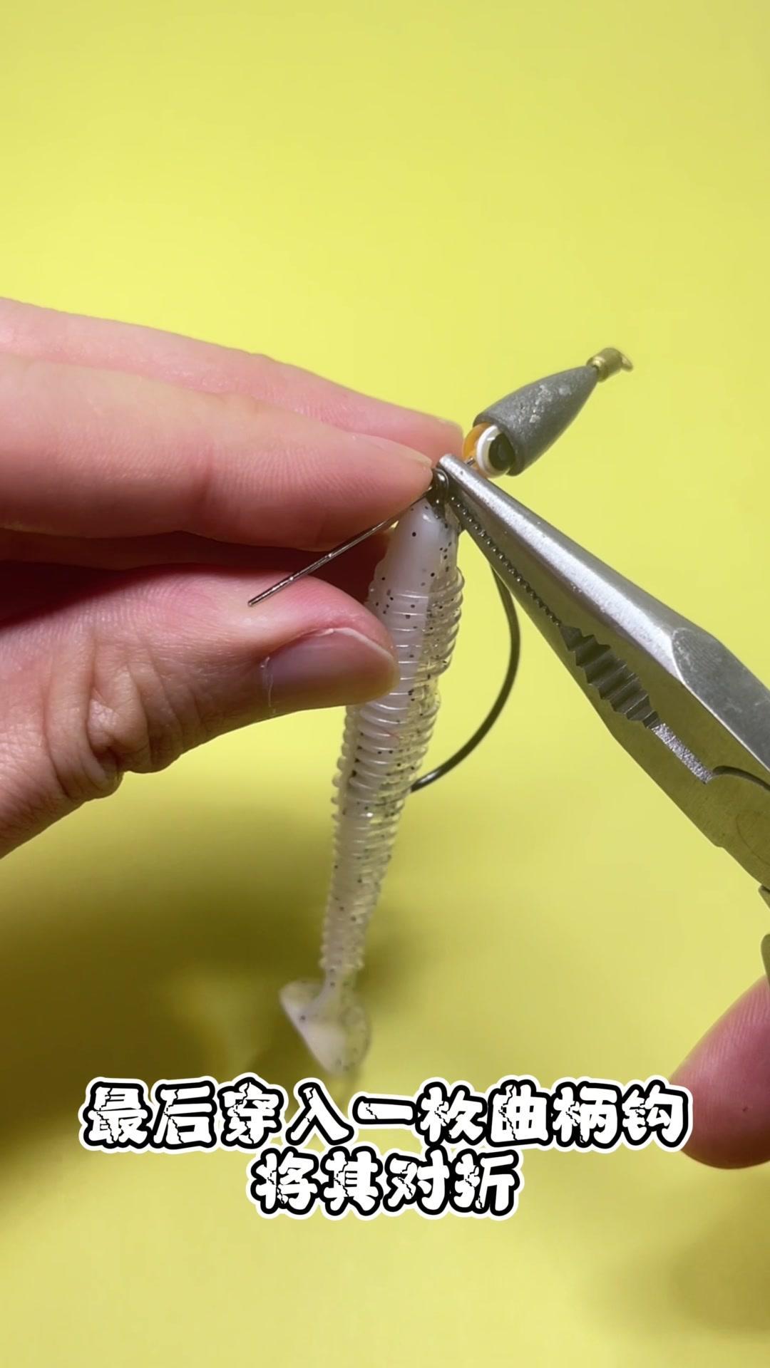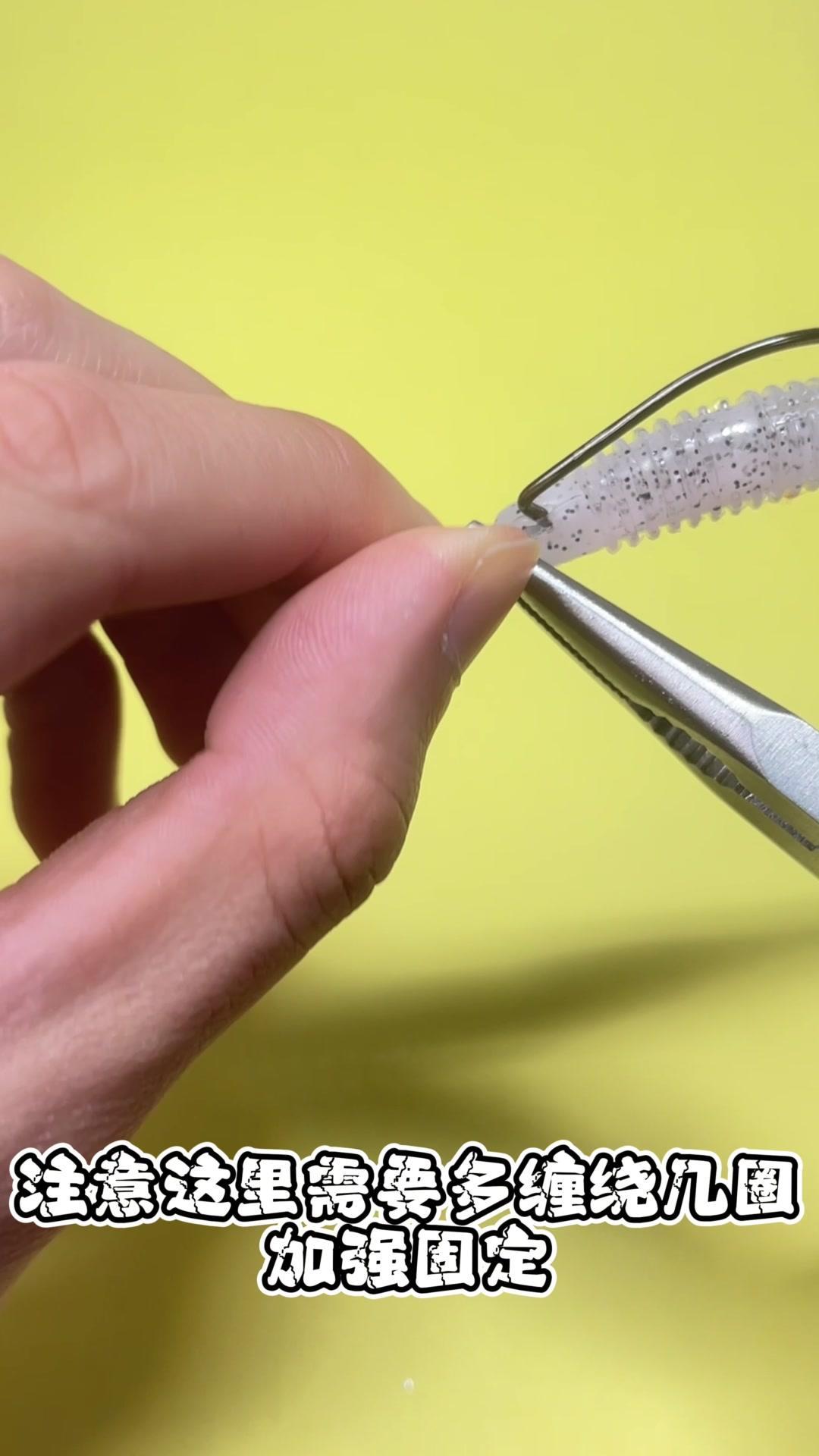 1️⃣取出一枚蚯蚓针,穿入子弹铅,再穿入一枚弹珠,最后穿入一枚曲柄钩,将其对折,用尖嘴钳夹住固定后旋转缠绕。 2️⃣注意这里需要多缠绕几圈加强固定。 你看,这样简单的几步,一个自制一体式的路亚德州钓组就完成了!