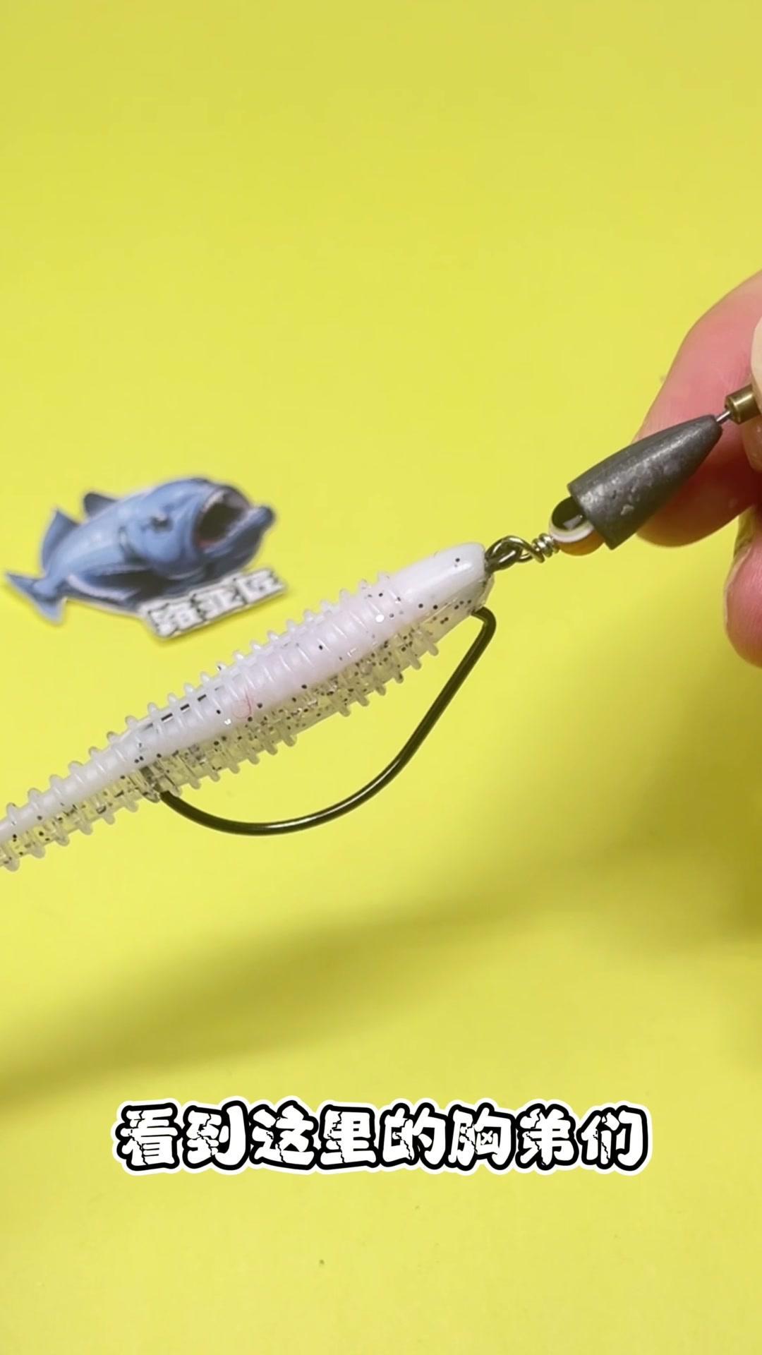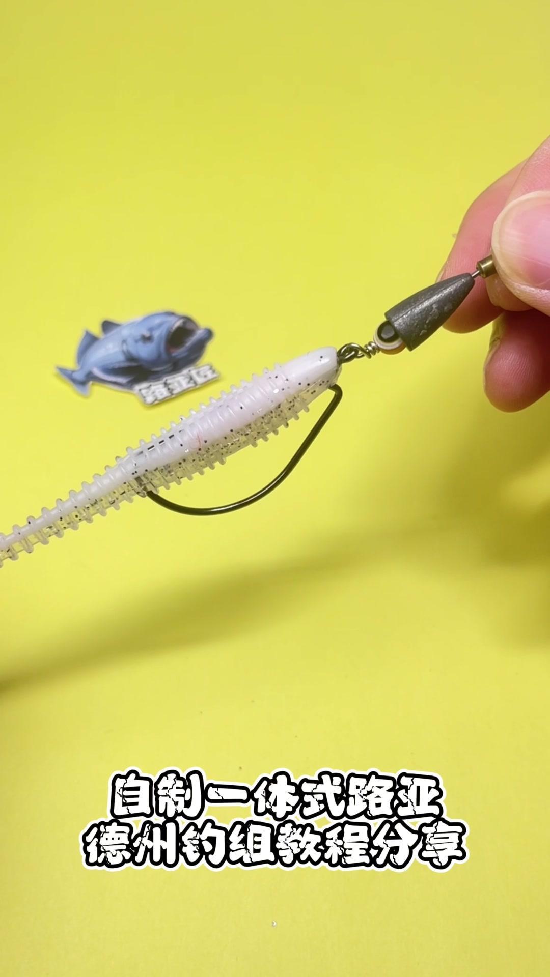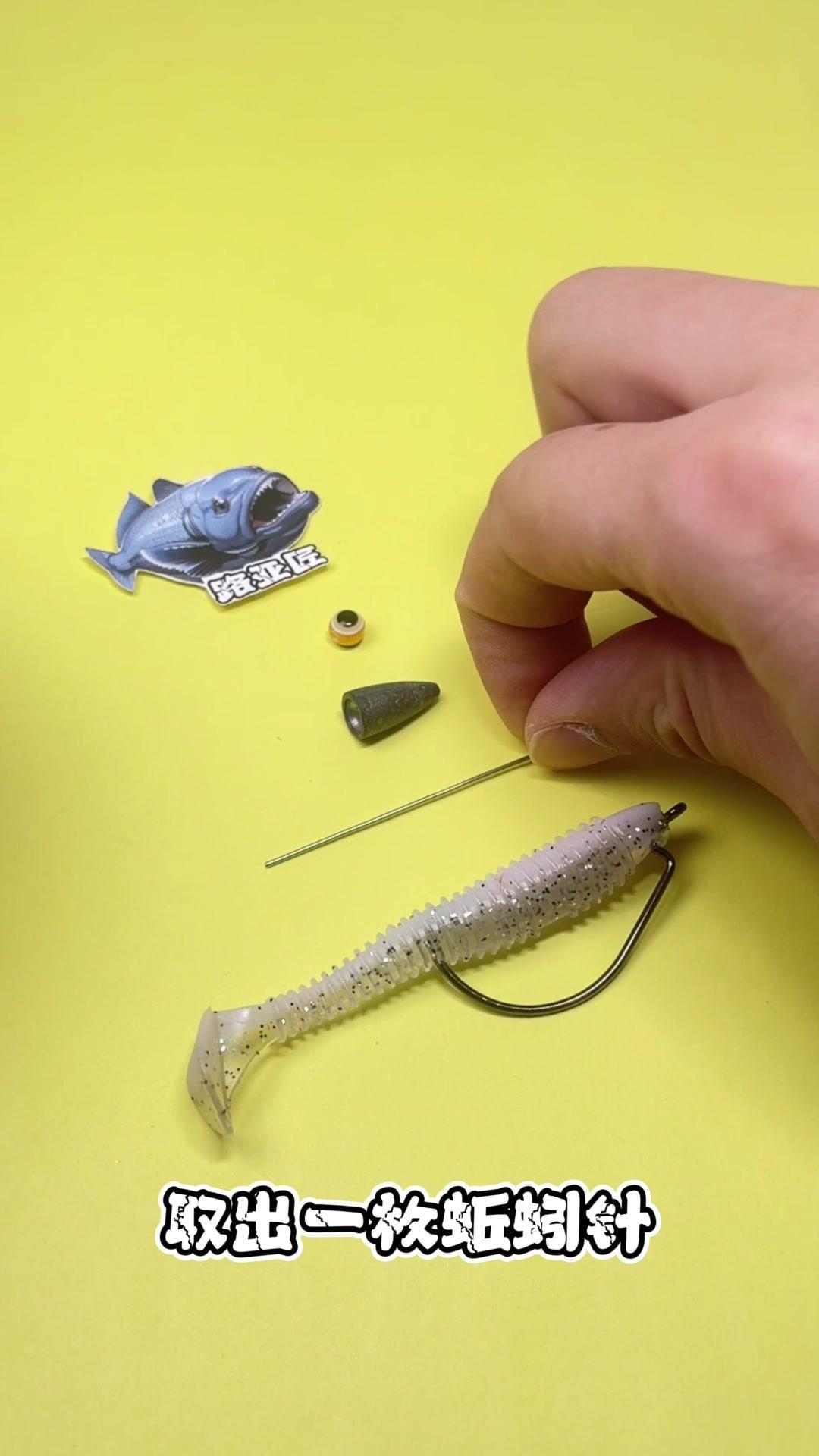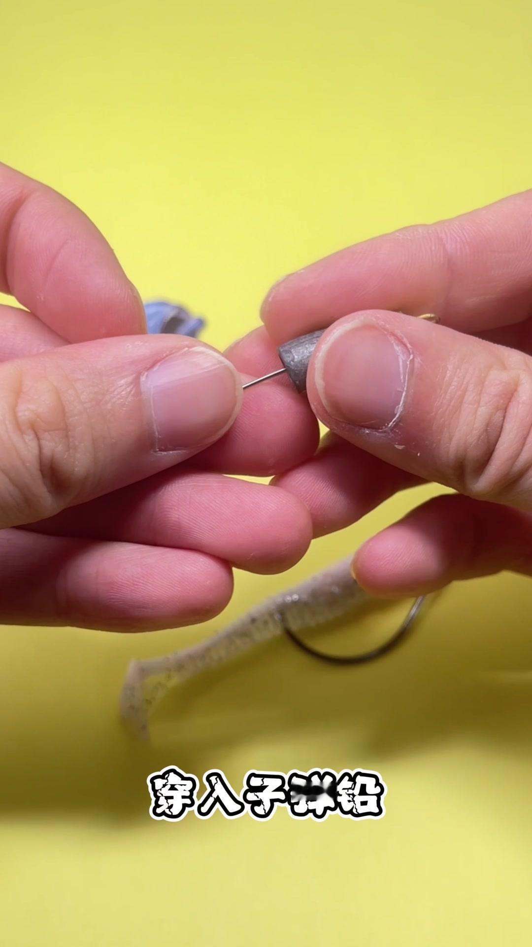 1️⃣取出一枚蚯蚓针,穿入子弹铅,再穿入一枚弹珠,最后穿入一枚曲柄钩,将其对折,用尖嘴钳夹住固定后旋转缠绕。 2️⃣注意这里需要多缠绕几圈加强固定。 你看,这样简单的几步,一个自制一体式的路亚德州钓组就完成了!