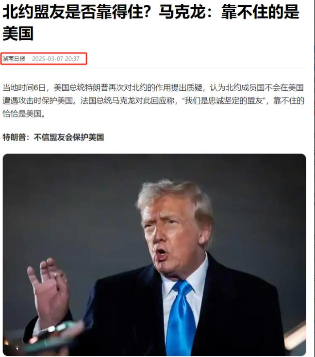 第二件事,法国称美国靠不住。美欧关系现裂痕,马克龙当众表示美国靠不住。原因在于美国对俄立场转变,甚至想退出北约,这让入戏太深的欧洲感到愤怒。欧洲开始搞事,支持乌克兰,重新武装自己,法国欲提供核保护,德国增军费,欧洲正在与美国分手。