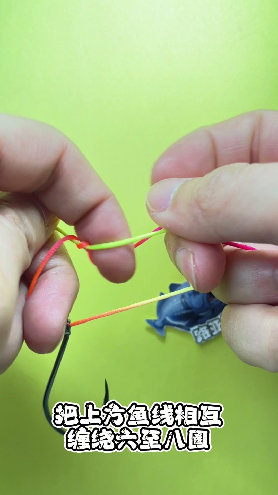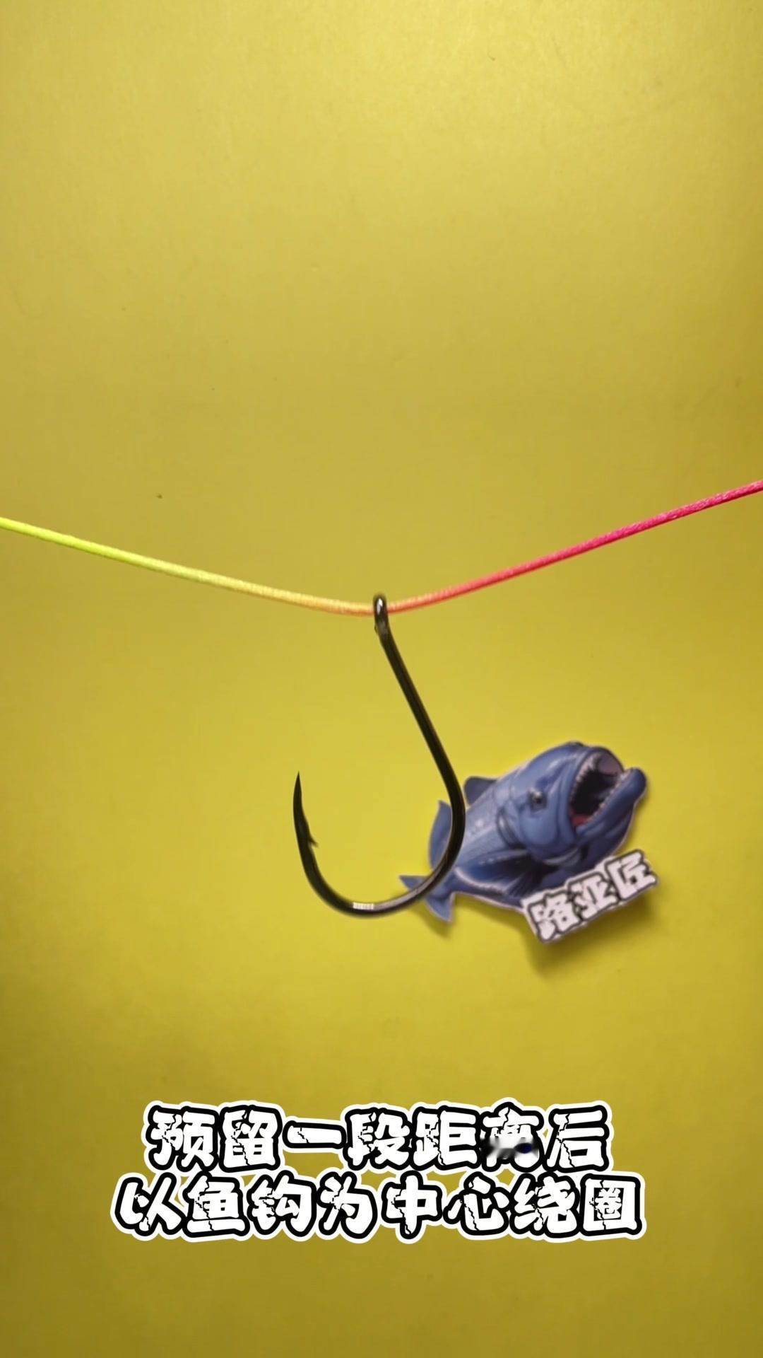 1️⃣将鱼线穿入,预留一段距离后,以鱼钩为中心绕圈。 2️⃣把上方鱼线相互缠绕6