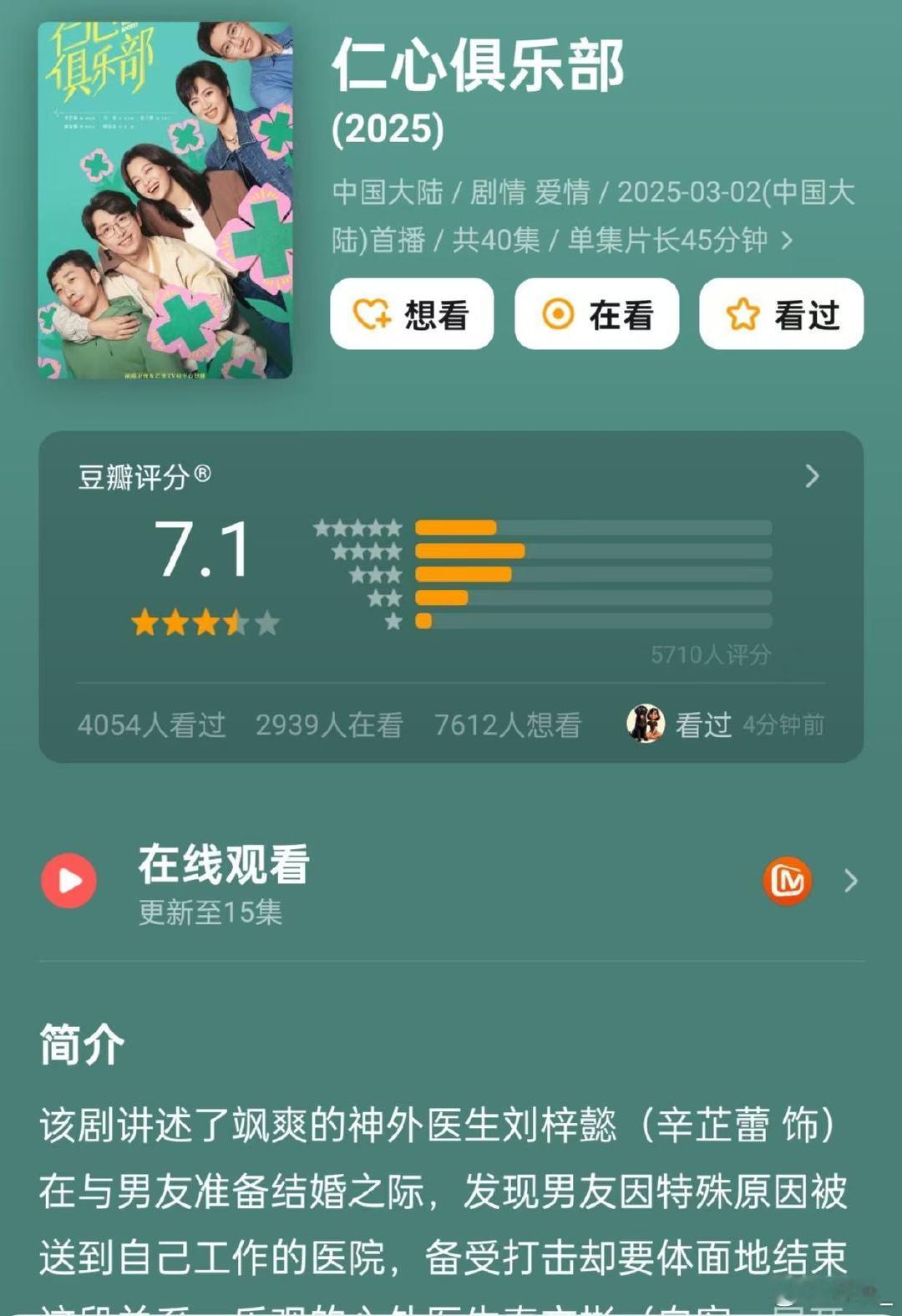 仁心俱乐部豆瓣开分7.1家人们,仁心俱乐部 豆瓣开分7.1了!这部剧真的很好看,