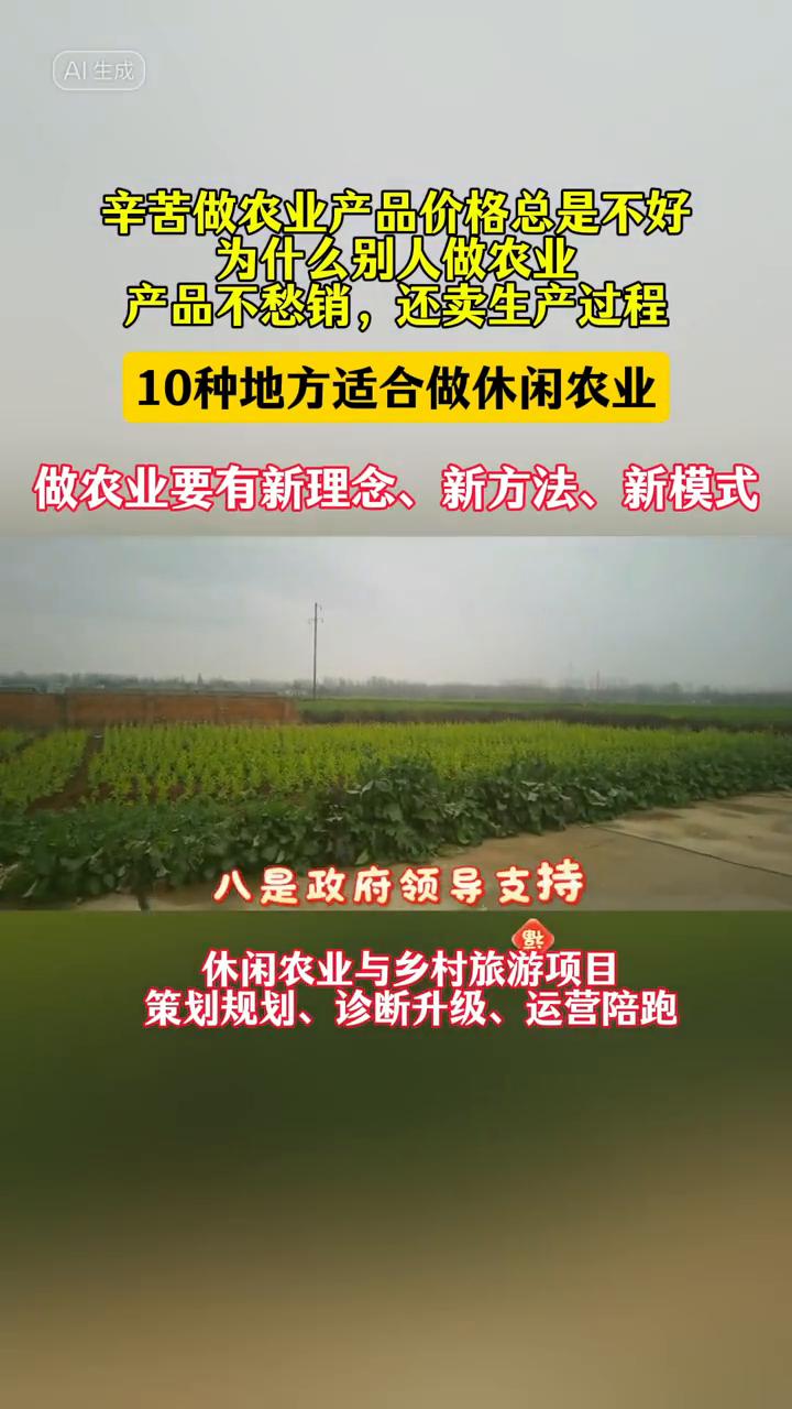 辛苦做农业产品价格总是不好,为什么别人做农业产品不愁销,还卖生产过程? 10种地方适合做休闲农业。做农业要有新理念、新方法、新模式。休闲农业与乡村旅游项目策划规划、诊断升级、运营陪跑。 10种地方特别适合做休闲农业: ·一、离大中城市或大景区很近的地方。 ·二、道路交通方便的地方。 ·三、农业发达或农业生产很有特色的地方。 ·四、土地流转与设施租赁便宜且民风好的地方。 ·五、有闲置厂房、宅基地或有建设用地的地方。 ·六、农村有帮手或身边有专业人才支持的地方。 ·七、生态条件好或有山有水有田园的地方。 ·八、政府领导支持休闲农业力度大的地方。 ·九、历史人文红色文化底蕴深厚的地方。 ·十、少数民族集聚的地方。