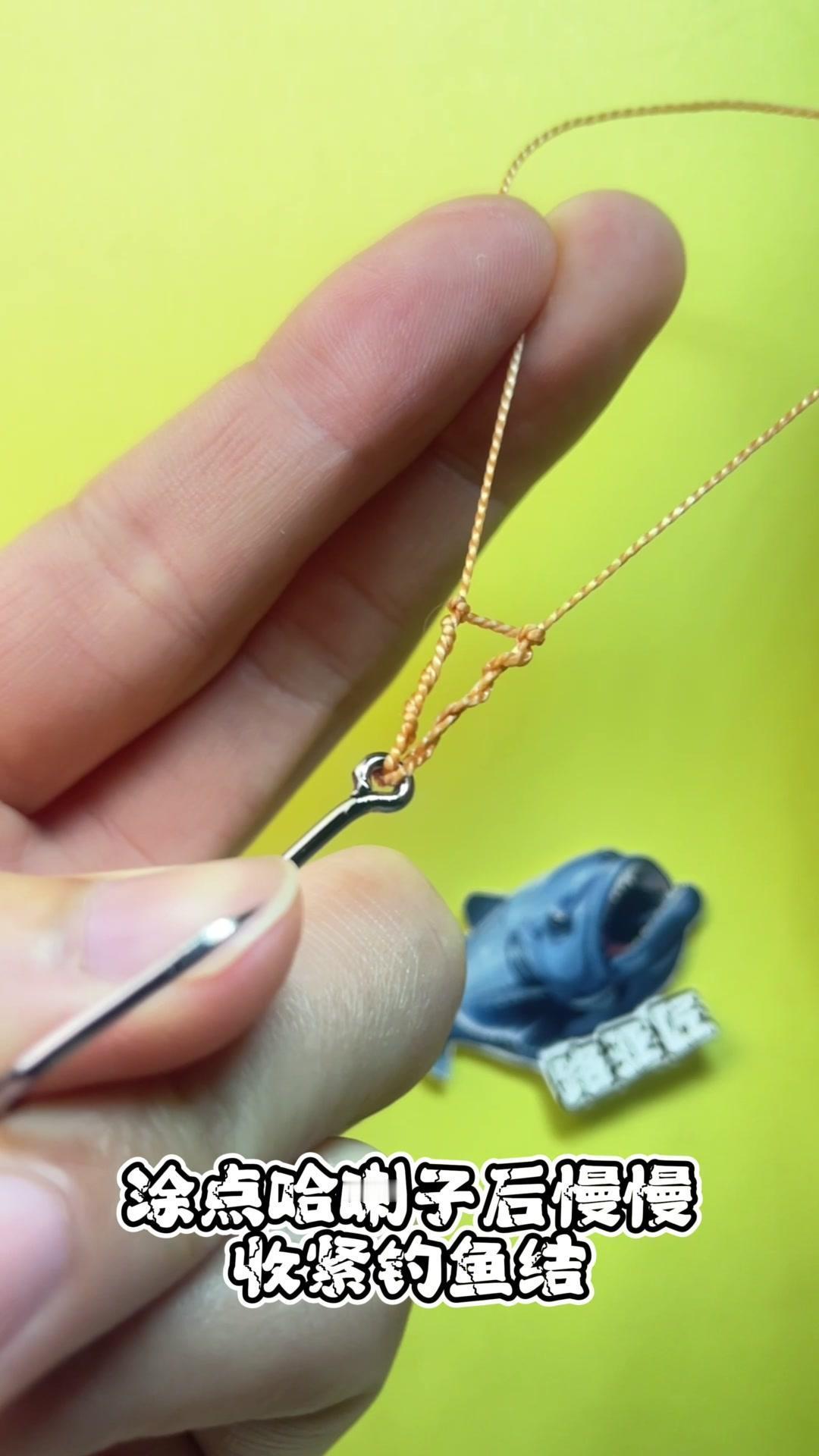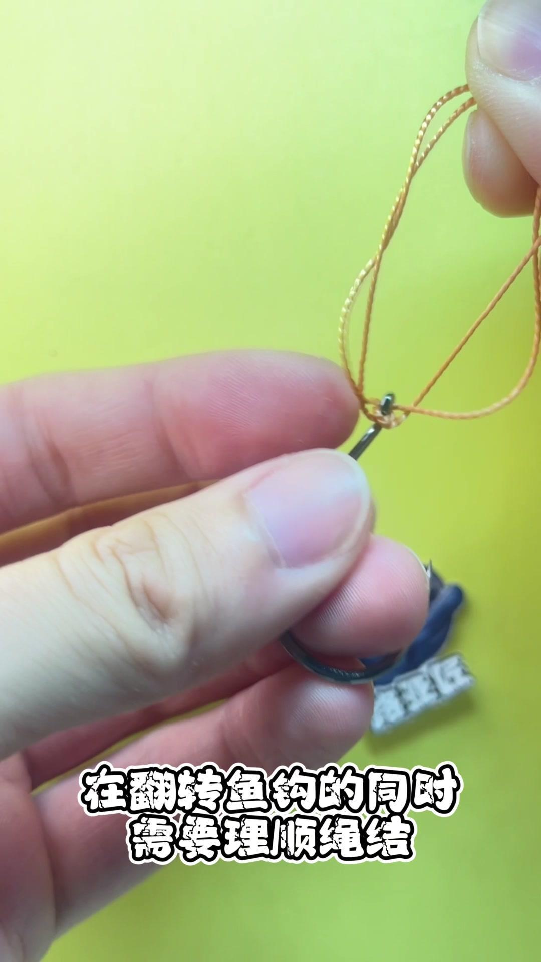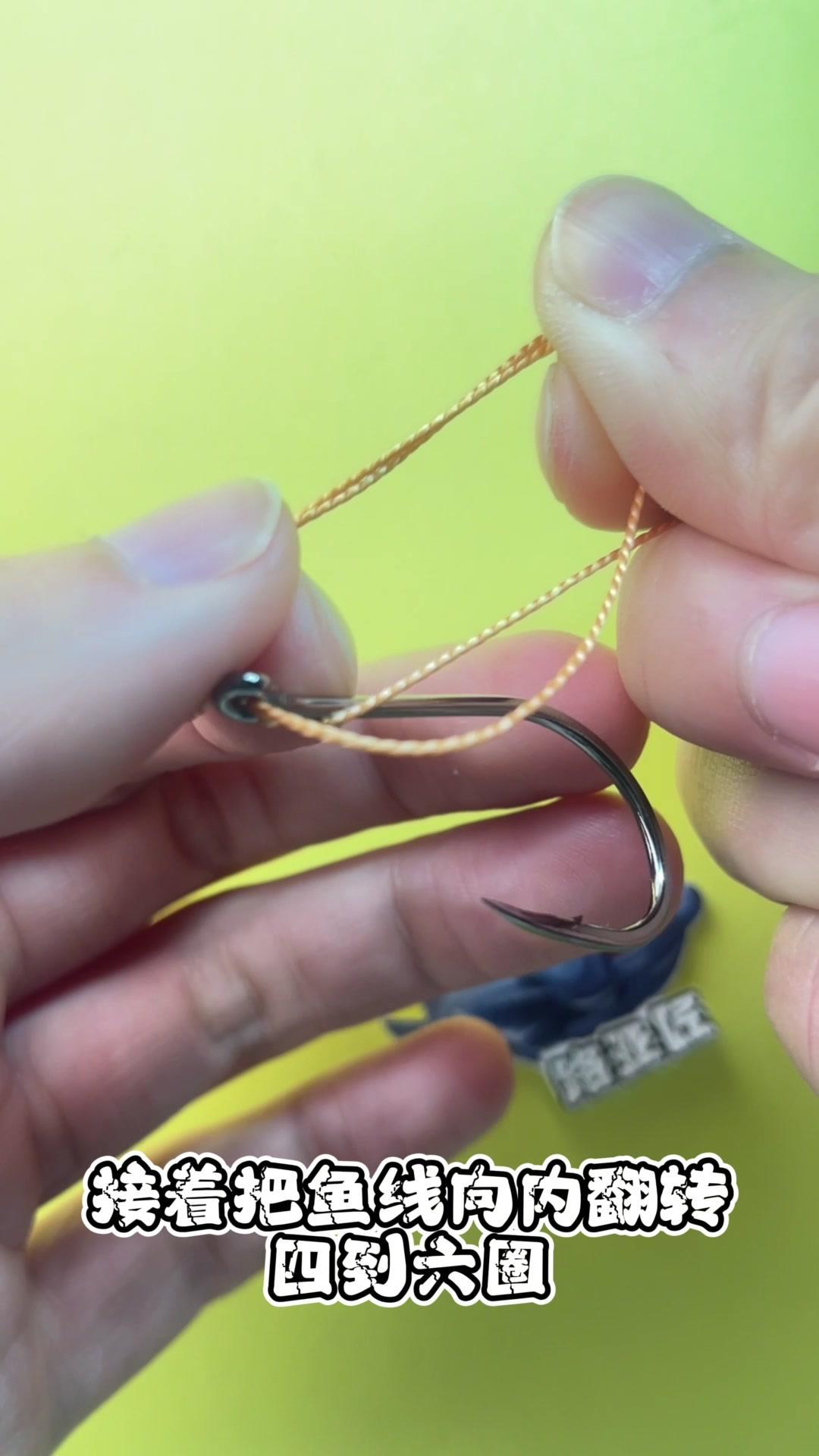 1️⃣将鱼线对折穿入,后折返,手指套入线圈固定。 2️⃣把鱼线向内翻转4-6圈,翻转鱼钩的同时理顺绳结。 3️⃣涂点胶水,慢慢收紧。
