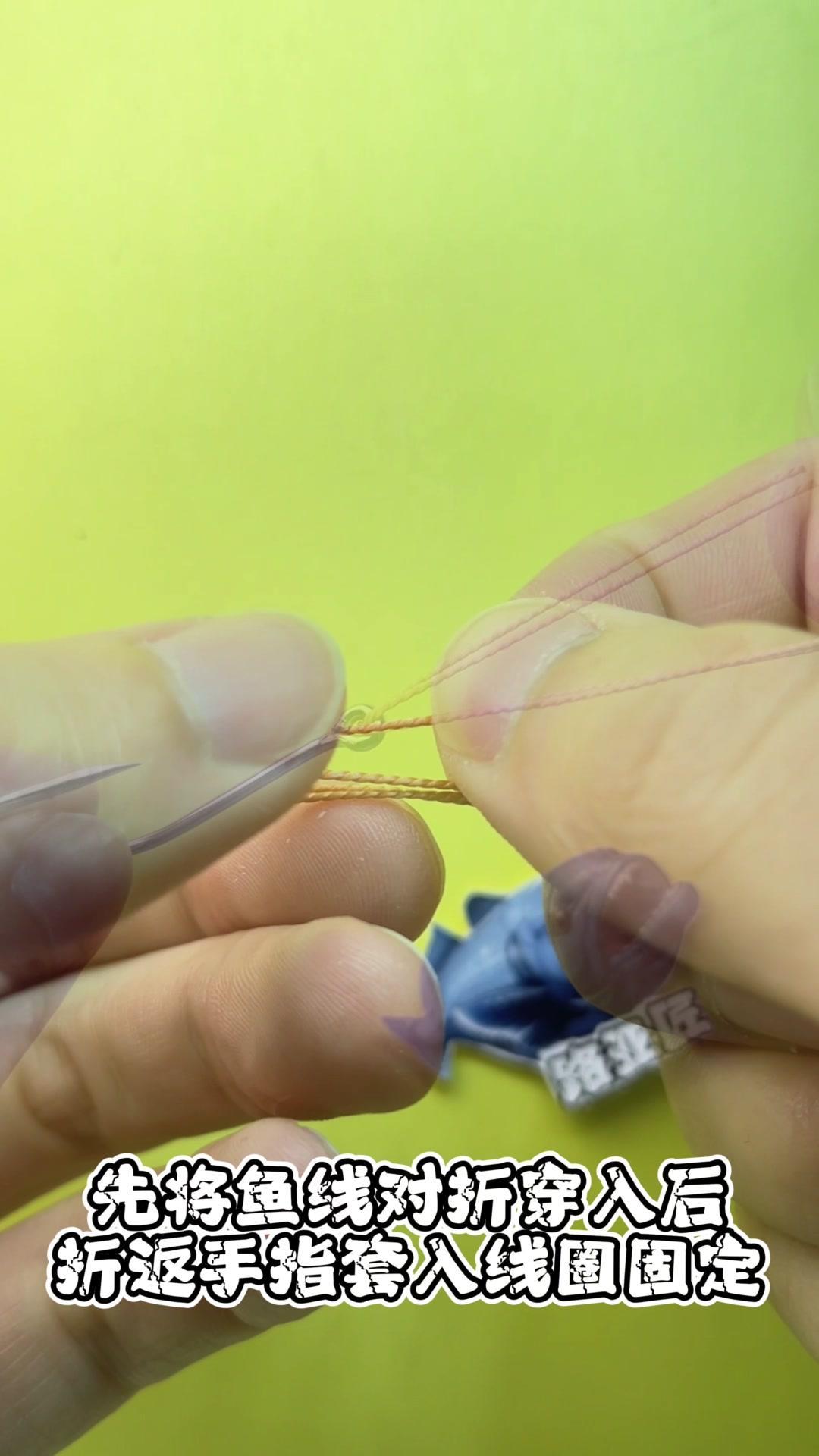 1️⃣将鱼线对折穿入,后折返,手指套入线圈固定。 2️⃣把鱼线向内翻转4-6圈,
