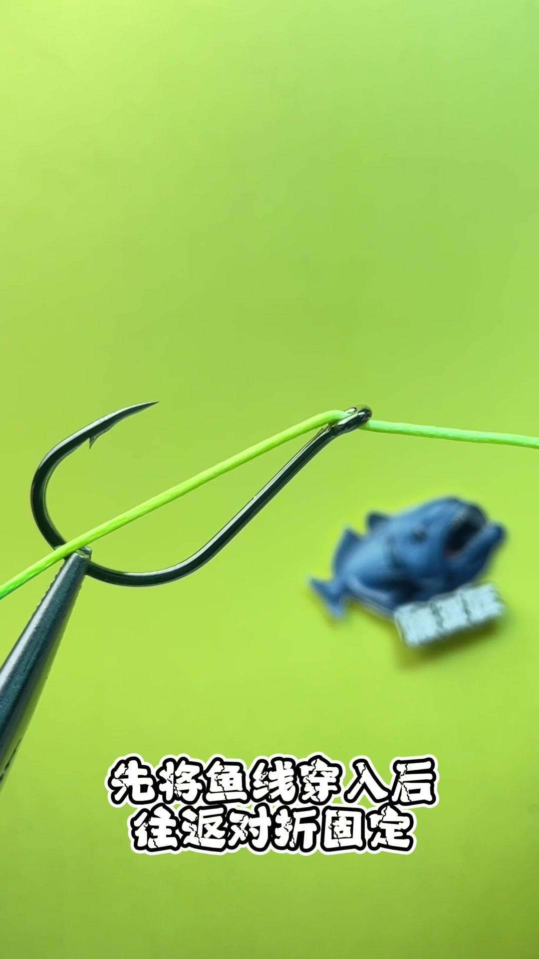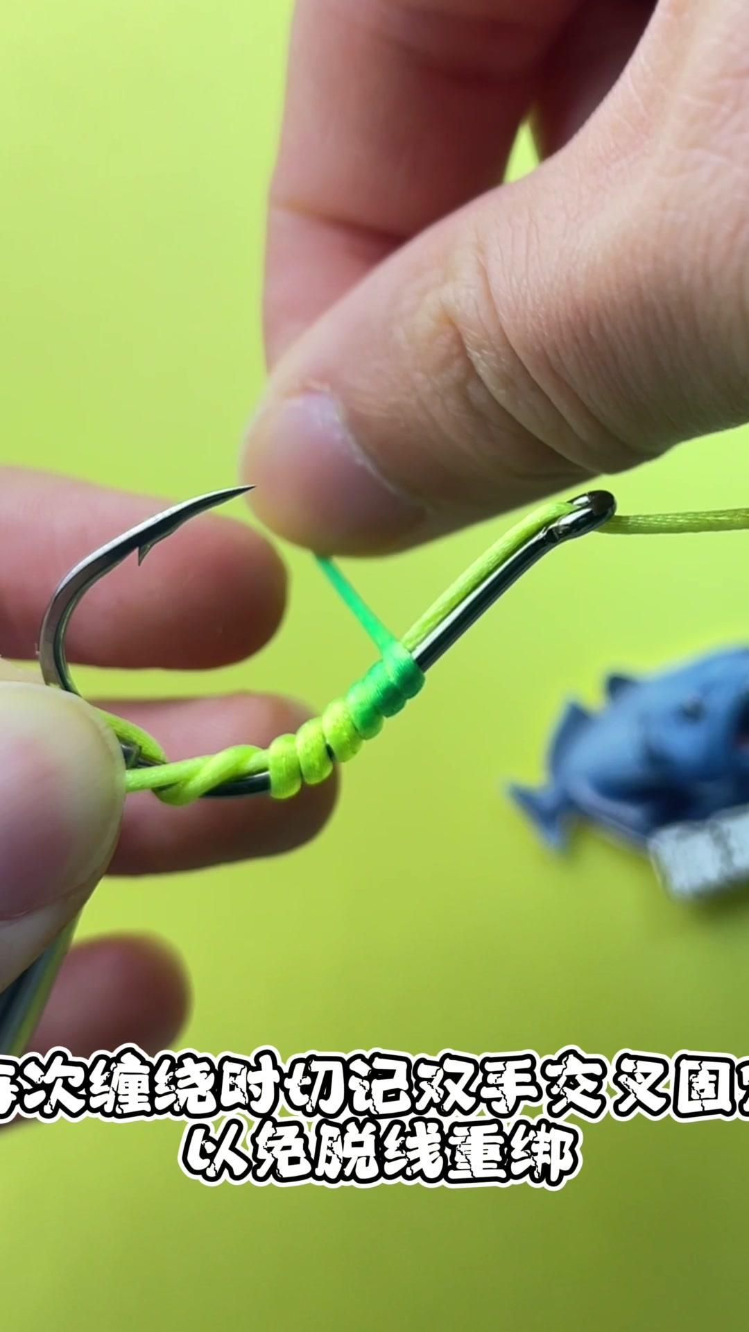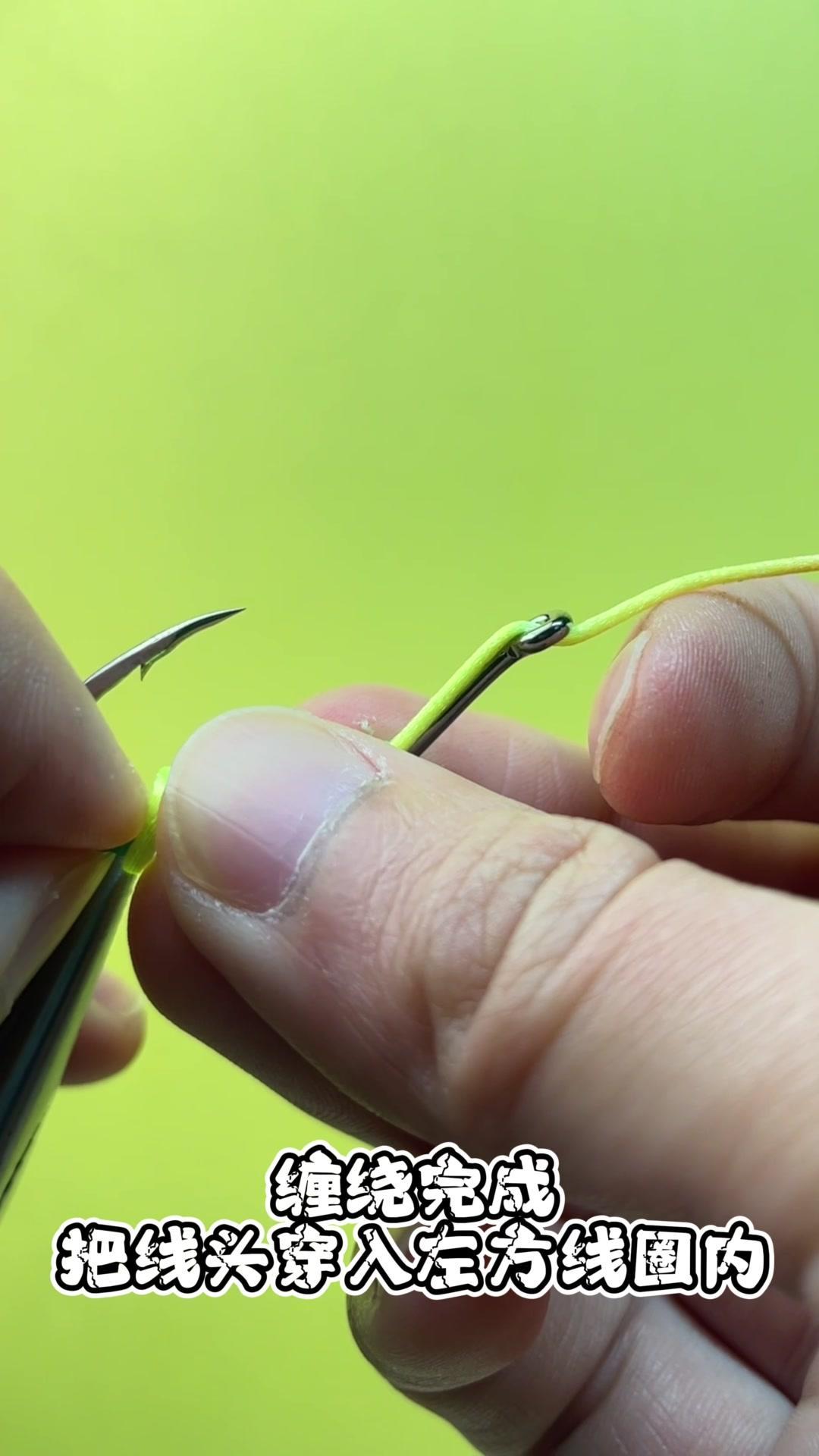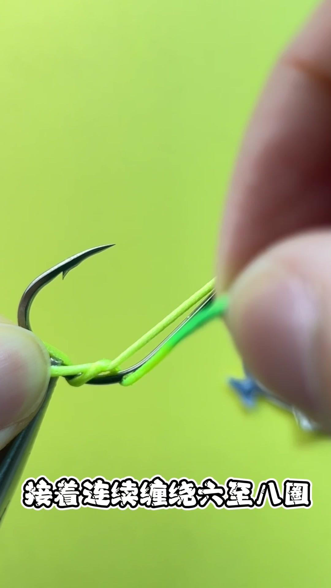 1️⃣先将鱼线穿入后,往返对折固定。 2️⃣接着连续缠绕六至八圈,每次缠绕时切
