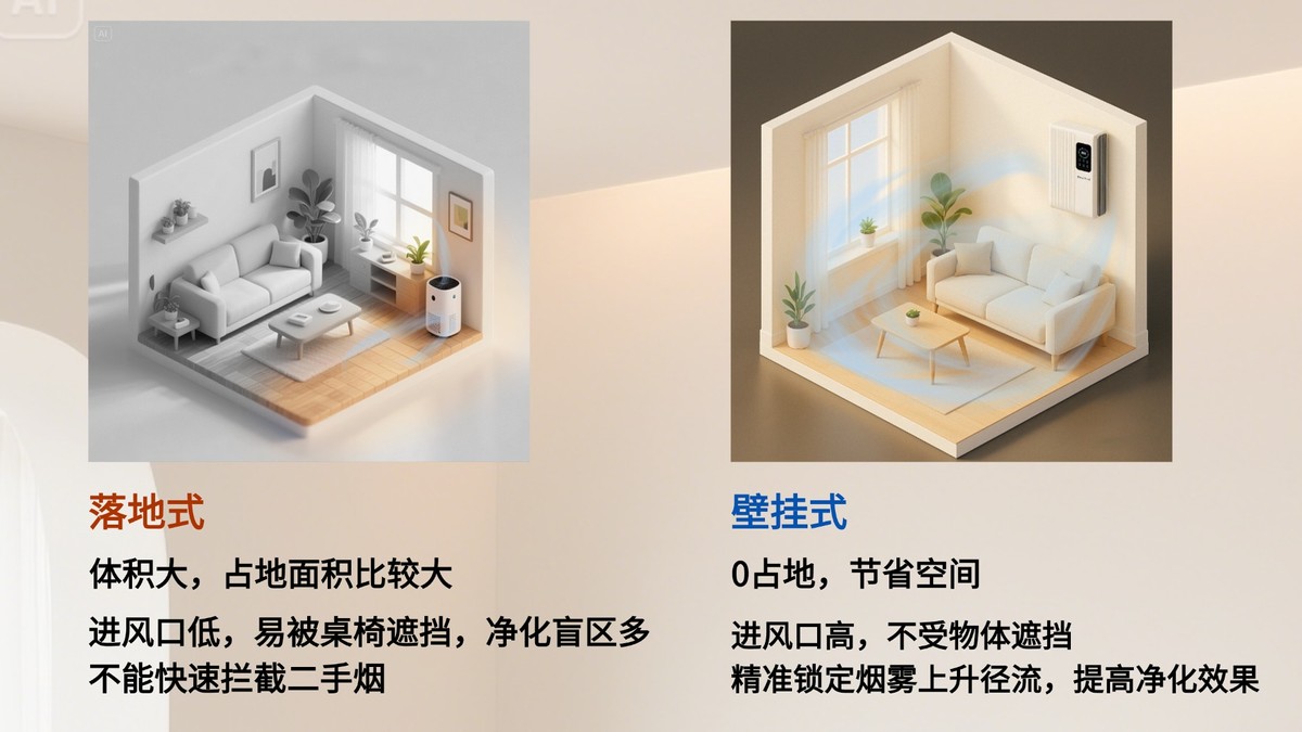 小型空气净化器怎么选?烟雾上升快,低位进风的机器往往吸不全。壁挂式高位进风更科学,能在烟雾扩散前提前吸附,净化速度更快,特别适合抽烟多的小空间。
