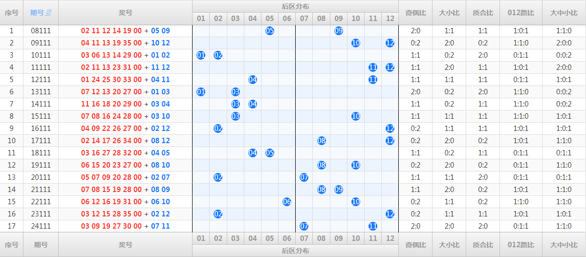 七、历史同期,后区开奖结果和走势图(历史数据演示):