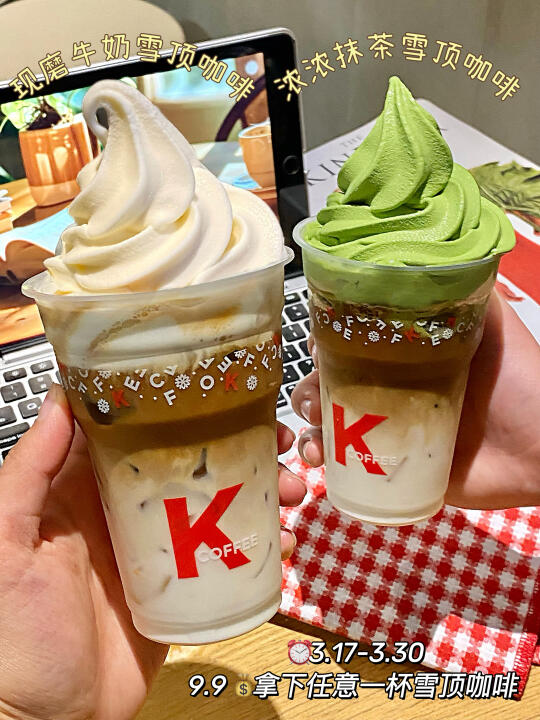 K咖啡你小汁是听劝的👍 📣3月17号K咖啡现磨牛奶雪顶回归~ 价格也太美丽了,3.17-3.30领券只要9.9 用的IIAC金奖咖啡豆哦,都是新鲜现磨的 颜值与口感并存!看着就好喝~ 冰淇淋奶香奶香的,而且完全不腻啊! 搭配现磨的咖啡,浓郁又顺滑 边吃冰淇淋边喝咖啡get双倍快乐! 浓浓抹茶雪顶咖啡 新款雪顶! 抹茶冰淇淋➕现磨咖啡➕牛奶🥛分层好好看 一口下去香浓丝滑,抹茶味混合着咖啡香 灵魂CP,来一杯我真的幸福了!! ⏰3.17上线大家记得带着搭子一起! 这杯快乐,我先干!