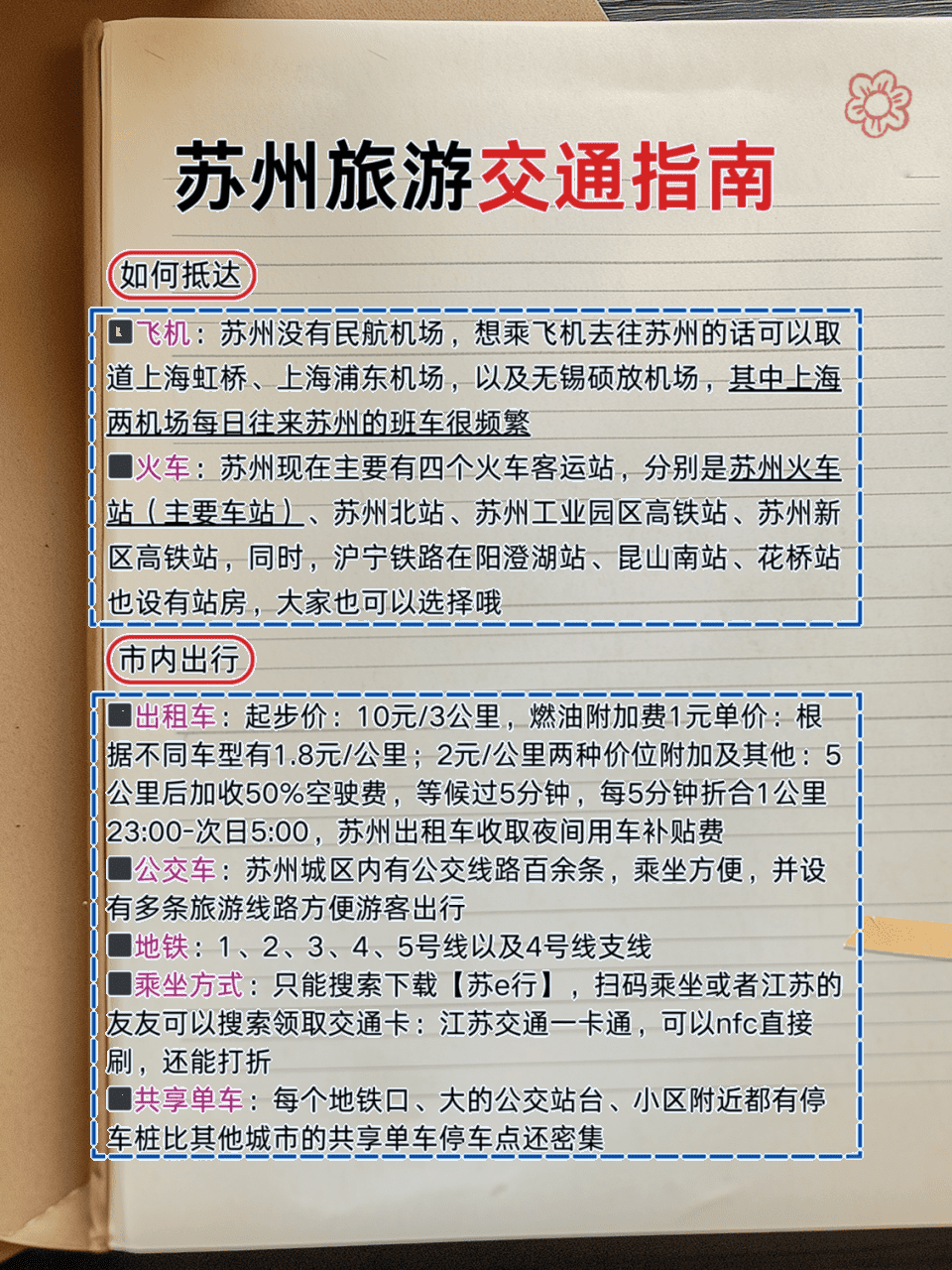 机场:可选上海虹桥、浦东机场或无锡硕放机场,都有频繁班车往返 火车:苏州有四个火车站,主站在市中心最方便 地铁:1-5号线覆盖主要景点 出租车:起步价10元/3公里,记得看好计价器 共享单车:地铁站、景点周边都有,特别方便