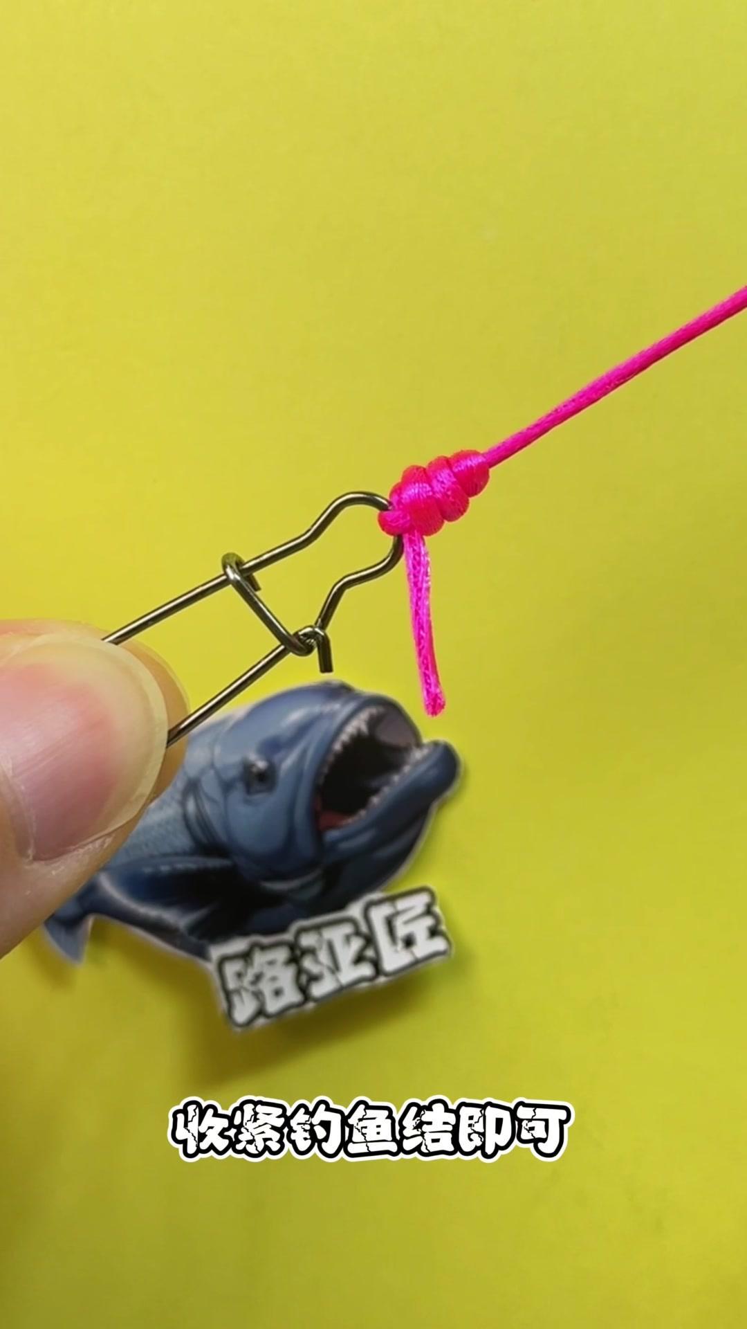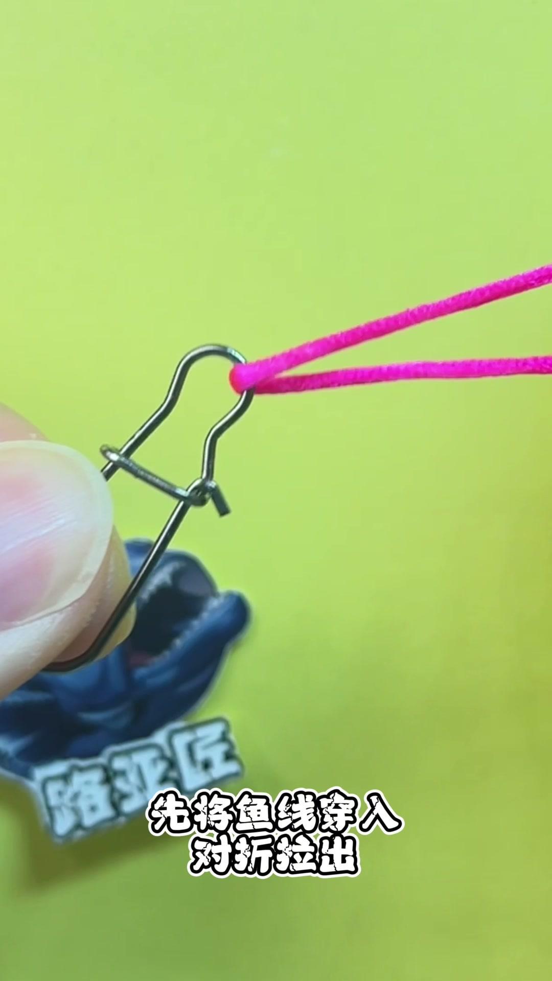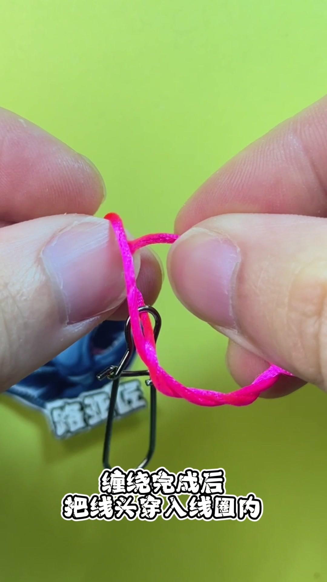 1️⃣将鱼线穿入别针,对折拉出。 2️⃣左手食指交叉穿入别针,旋转4-6圈。 3️⃣缠绕完成后,把线头穿入线圈内,收紧钓鱼结即可。