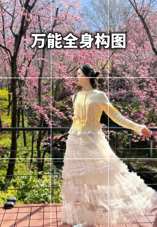 脚抵在九宫格最下面的一根线上,头顶大概留一格,画面稍微放大一点点,随便拍都是大长腿!