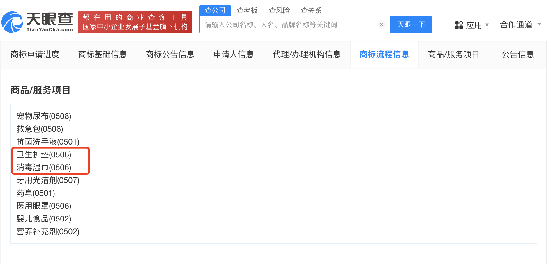 天眼查知识产权信息显示,小米科技有限责任公司此前已取得的“小米”商标中,包含消毒湿巾、救急包、卫生护垫、医用眼罩等商品服务。