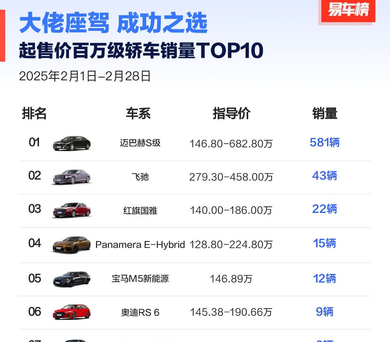 还得是迈巴赫!百万级轿车,还得是迈巴赫S级!月销581辆,遥遥领先!第二名飞驰销量只有两位数! 值得一提的是,红旗国雅月销22辆排名第三,可喜可贺! 大家猜猜,尊界S800上市后,月销量能有多少?