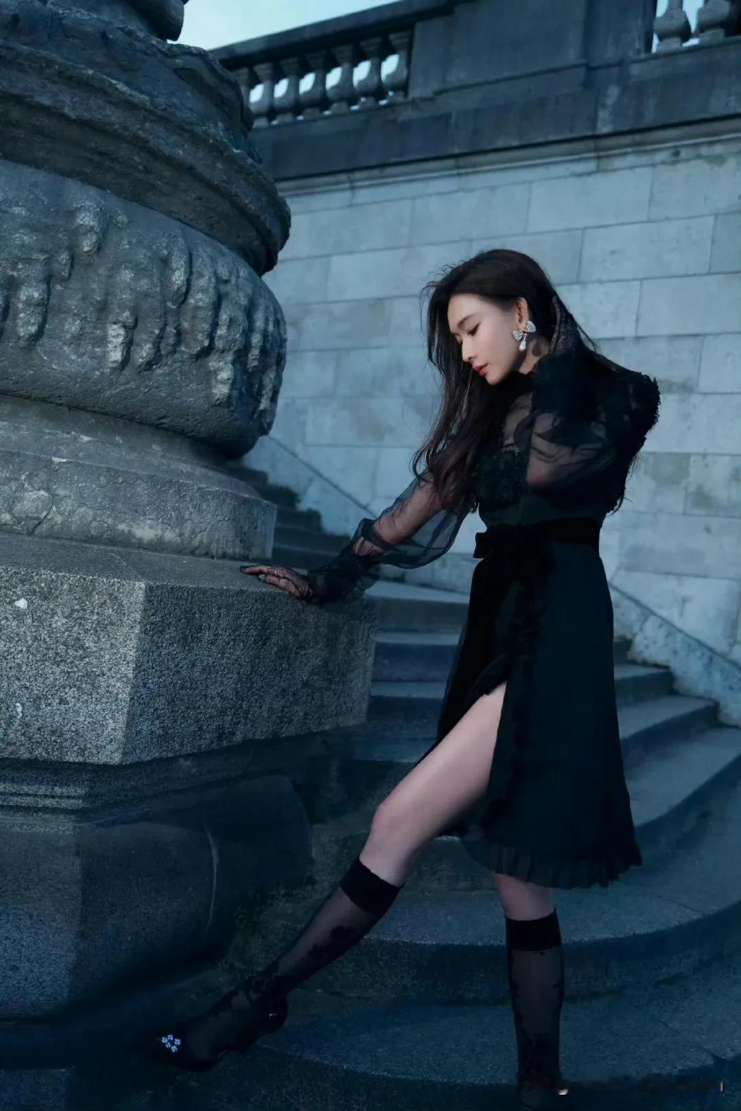 在欧式建筑旁,林志玲身姿绰约。一袭黑色蕾丝裙,于朦胧薄纱间尽显性感,精致的蕾丝花纹似诉说着浪漫。她或倚石柱,或坐石阶,发丝随风飘动,举手投足间,优雅气质自然流露,在光影交错中,美得令人心动!