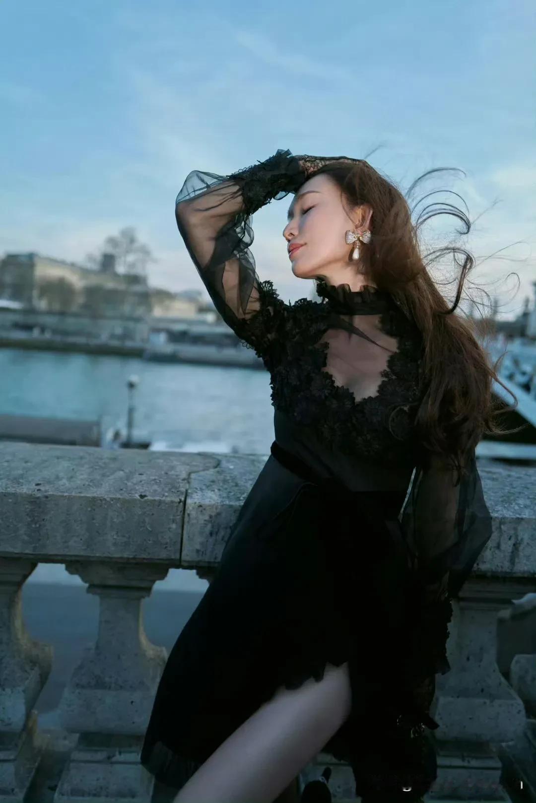 在欧式建筑旁,林志玲身姿绰约。一袭黑色蕾丝裙,于朦胧薄纱间尽显性感,精致的蕾丝花