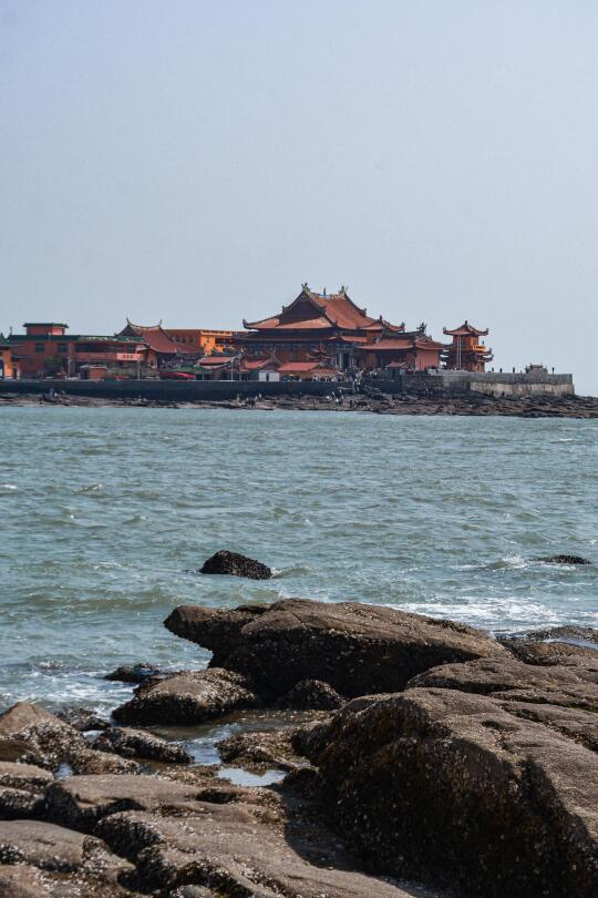 ①寺庙的一边就能直接看到大海听浪拍礁石的声音,但海不蓝