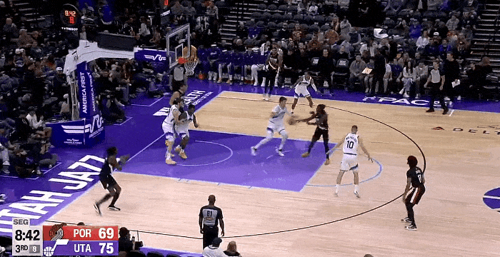 NBA季前赛,爵士对阵开拓者的比赛正在进行中。第三节比赛中,格兰特三分4中3砍下19分,同时贡献2抢断3盖帽。