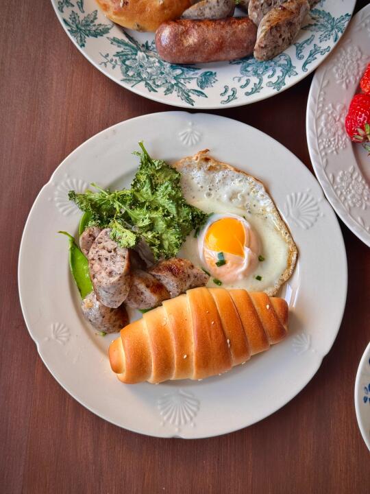 早上在露台找了点羽衣甘蓝烤来吃 美味哦😋还有荷兰豆~甜甜的 跟着香肠星球做的黑胡椒肠很成功 还有本地小草莓