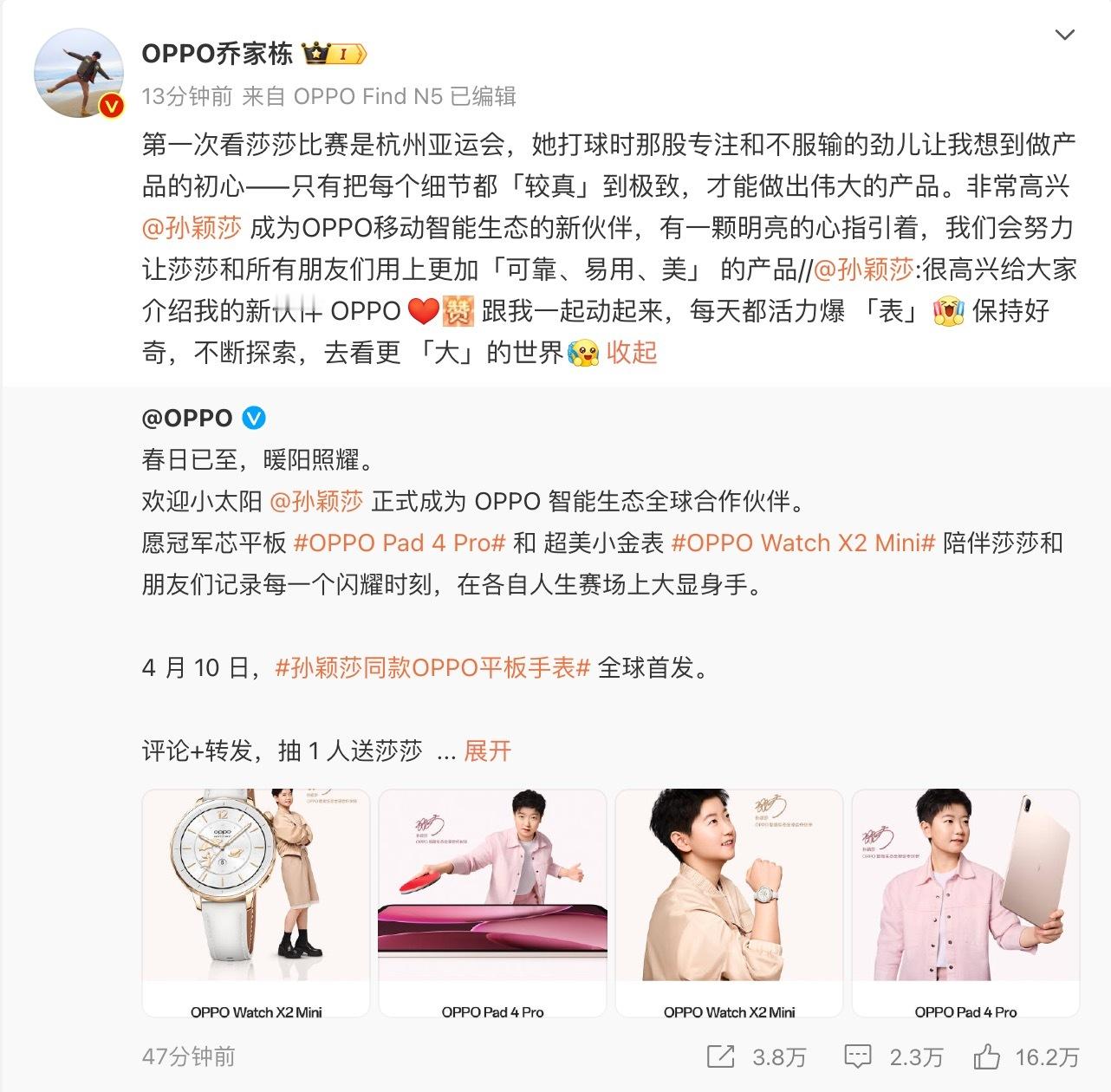 孙颖莎OPPO智能生态全球合作伙伴,共绘智能未来新蓝图!近日,乔家栋路透曝光,孙颖莎与OPPO的携手合作再添新篇章。作为乒坛的璀璨明星,孙颖莎以不凡实力展现着国乒风采;而OPPO作为智能生态的引领者,正以前沿科技赋能美好生活。OPPO孙颖莎,这不仅是品牌与运动员的强强联合,更是智能科技与体育精神的完美融合。