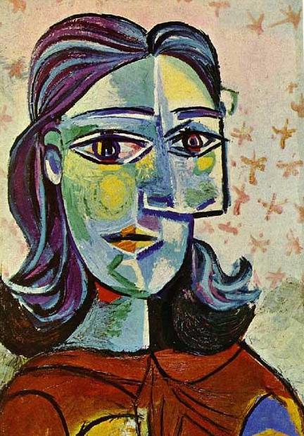 在这条路上,毕加索从头开始,先从双面脸入手,把人的正面和侧面融为一体,再到后来彻底将人物和物体的各个角度重新组合。
