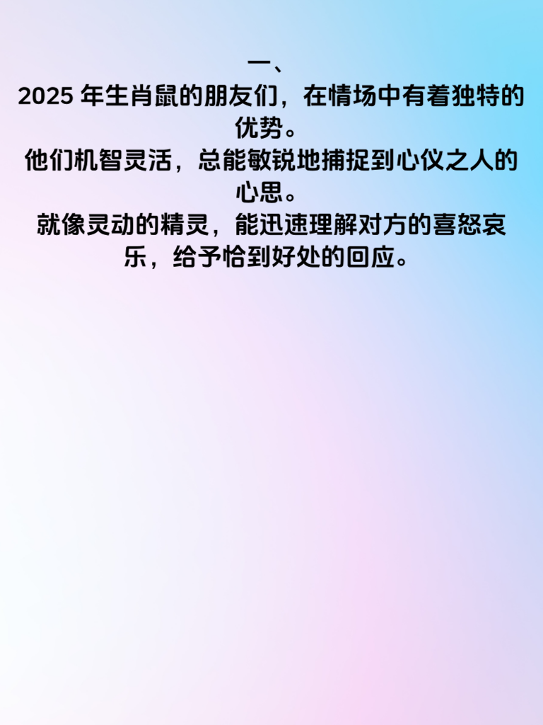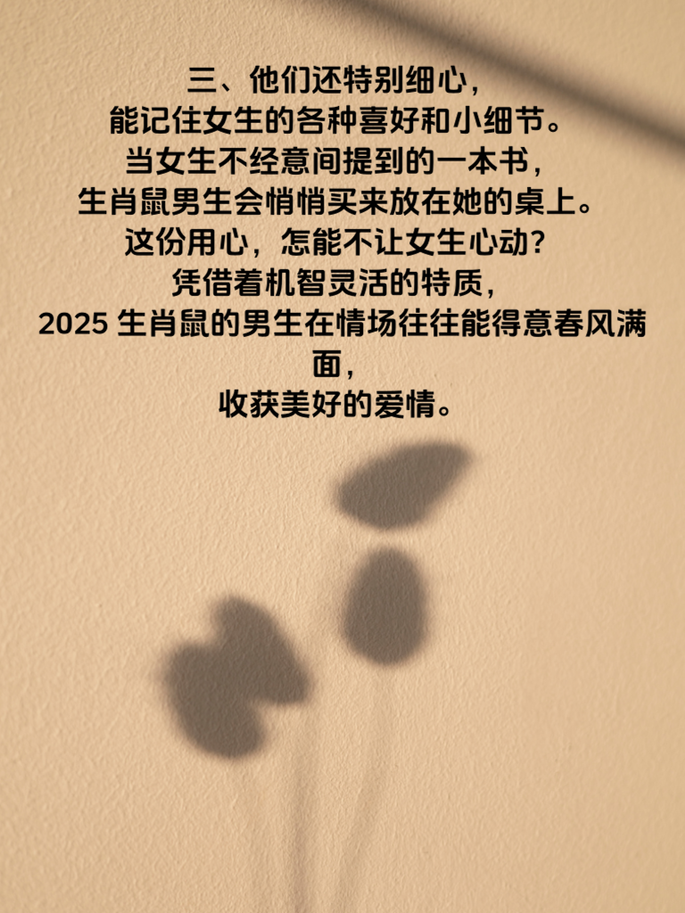 一、2025年生肖鼠的朋友们,在情场中有着独特的优势。他们机智灵活,总能敏锐地捕捉到心仪之人的心思。就像灵动的精灵,能迅速理解对方的喜怒哀乐,给予恰到好处的回应。 二、生肖鼠的男生在追求女生时,懂得巧妙运用自己的智慧。他们善于制造浪漫又不失惊喜的约会场景,让女生在每一次相处中都充满新鲜感。比如精心策划一场星空下的野餐,或是一场温馨的密室逃脱,在互动中拉近彼此距离。 三、他们还特别细心,能记住女生的各种喜好和小细节。当女生不经意间提到的一本书,生肖鼠男生会悄悄买来放在她的桌上。这份用心,怎能不让女生心动?凭借着机智灵活的特质,2025生肖鼠的男生在情场往往能得意春风满面,收获美好的爱情。