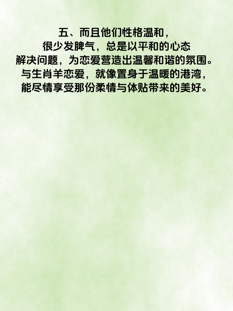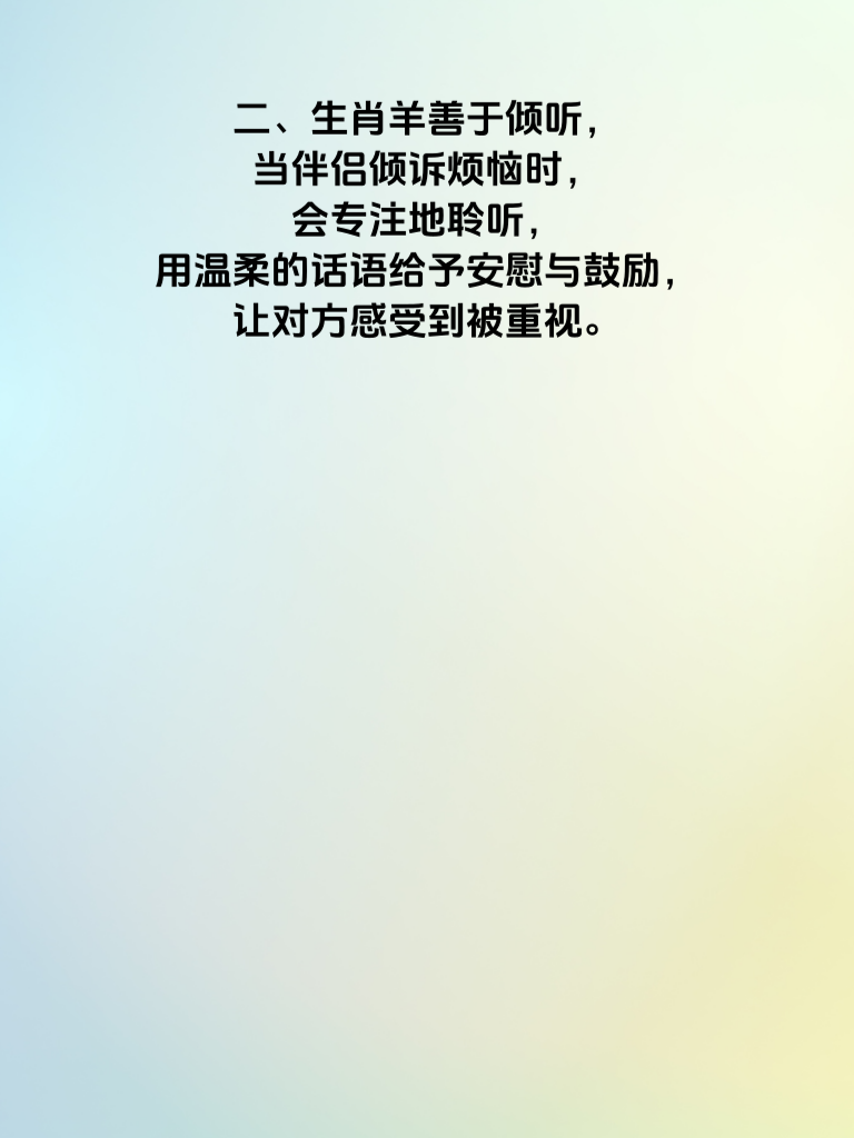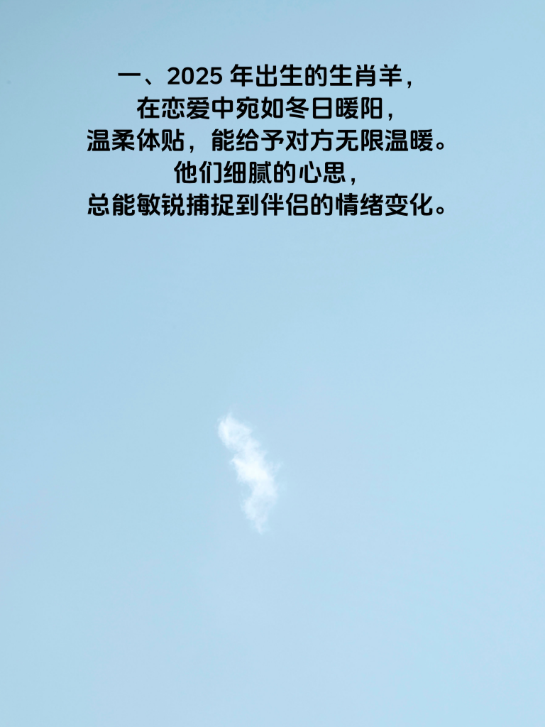 一、2025 年出生的生肖羊,在恋爱中宛如冬日暖阳,温柔体贴,能给予对方无限温暖。他们细腻的心思,总能敏锐捕捉到伴侣的情绪变化。 二、生肖羊善于倾听,当伴侣倾诉烦恼时,会专注地聆听,用温柔的话语给予安慰与鼓励,让对方感受到被重视。 三、日常相处中,他们贴心备至。会记得对方的喜好,在不经意间送上小惊喜。比如,知道对方喜欢某种花,就悄悄买好插在花瓶里。 四、在伴侣疲惫时,生肖羊会默默准备好热水,轻柔地按摩,用行动传递着关爱。 五、而且他们性格温和,很少发脾气,总是以平和的心态解决问题,为恋爱营造出温馨和谐的氛围。与生肖羊恋爱,就像置身于温暖的港湾,能尽情享受那份柔情与体贴带来的美好。