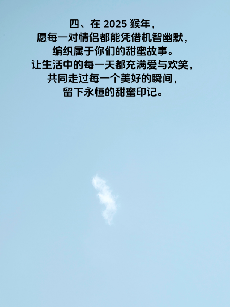 一、2025 年的猴年,对于情侣们来说,注定是充满甜蜜与惊喜的一年。在这一年里,机智幽默将成为你们感情升温的秘密武器。想象一下,在每一个平凡的日子里,用一个恰到好处的小玩笑,打破生活的沉闷,让彼此的笑容更加灿烂。 二、共同享受甜蜜时光,需要你们用心去经营。比如一起计划一场说走就走的旅行,在旅途中,探索未知的风景,分享彼此的发现。或者在夜晚的星空下,来一场浪漫的野餐,聊聊未来的梦想,感受那份专属的宁静与温馨。 三、男生们,追求女生时更要发挥机智幽默的魅力。适时地开个小玩笑,缓解尴尬的气氛。当她遇到困难时,用幽默的方式帮她排忧解难,让她知道你总能给她带来快乐。而女生们,也不要吝啬你的笑容和幽默回应,与他一起创造更多欢乐的回忆。 四、在 2025 猴年,愿每一对情侣都能凭借机智幽默,编织属于你们的甜蜜故事。让生活中的每一天都充满爱与欢笑,共同走过每一个美好的瞬间,留下永恒的甜蜜印记。