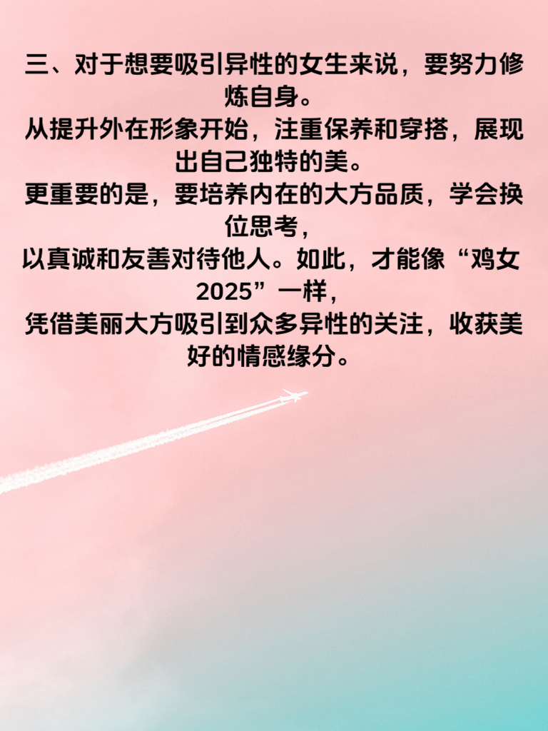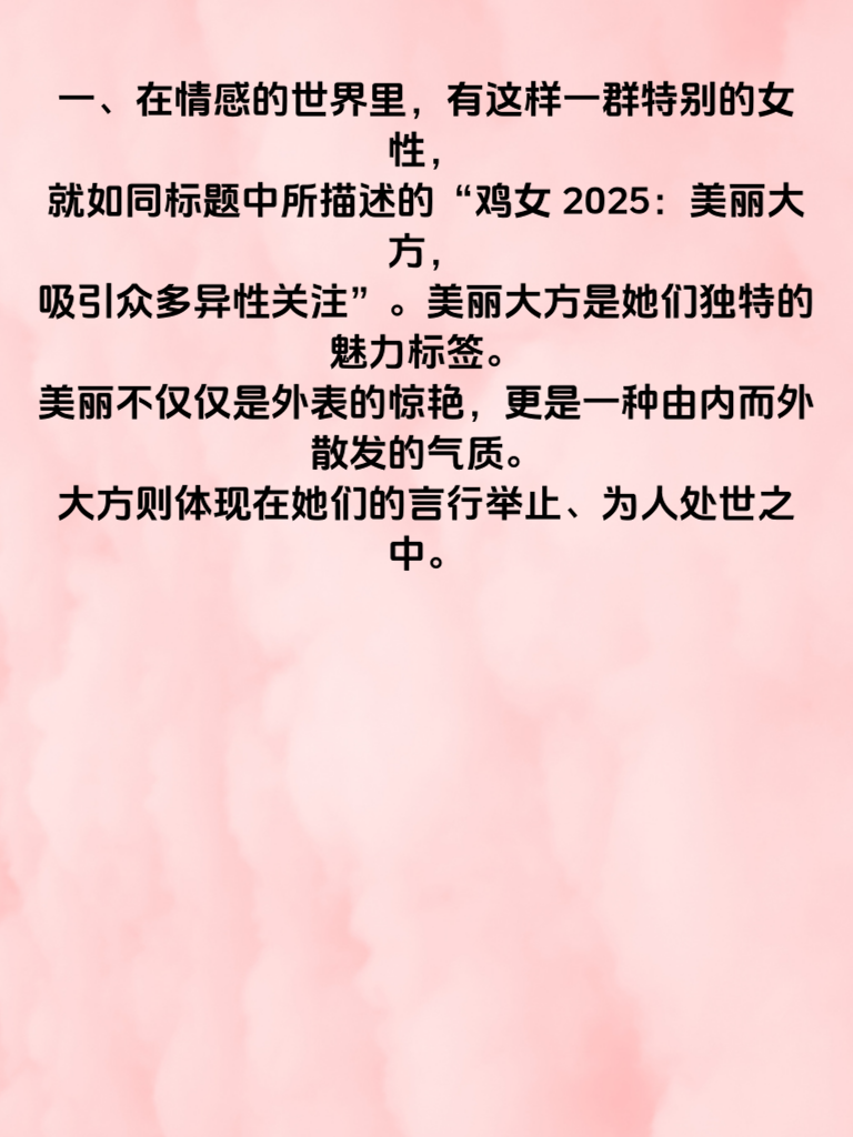 一、在情感的世界里,有这样一群特别的女性,就如同标题中所描述的“鸡女2025:美丽大方,吸引众多异性关注”。美丽大方是她们独特的魅力标签。美丽不仅仅是外表的惊艳,更是一种由内而外散发的气质。大方则体现在她们的言行举止、为人处世之中。 二、拥有美丽的外表能让她们在人群中迅速被注意到,但真正长久吸引异性的是那份大方的特质。大方的她们懂得尊重他人,不会斤斤计较。与人相处时,总能展现出宽容和理解,让身边的人都感到舒适自在。 三、对于想要吸引异性的女生来说,要努力修炼自身。从提升外在形象开始,注重保养和穿搭,展现出自己独特的美。更重要的是,要培养内在的大方品质,学会换位思考,以真诚和友善对待他人。如此,才能像“鸡女2025”一样,凭借美丽大方吸引到众多异性的关注,收获美好的情感缘分。