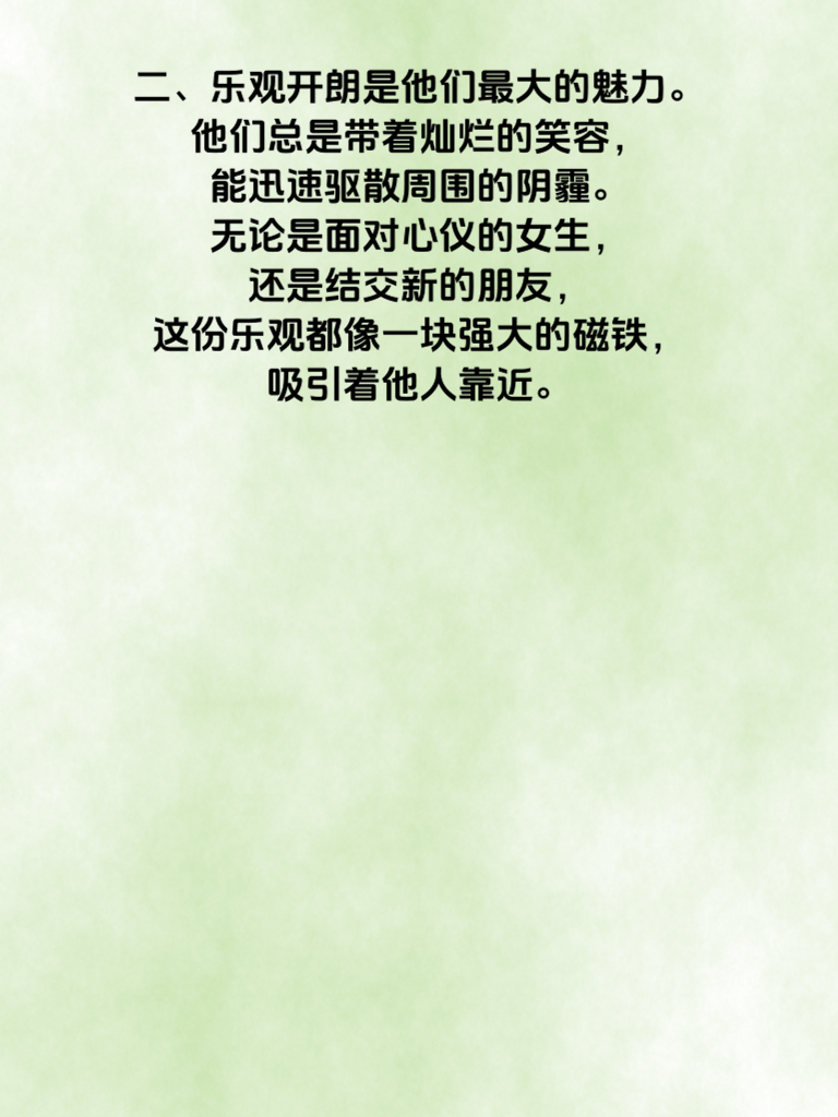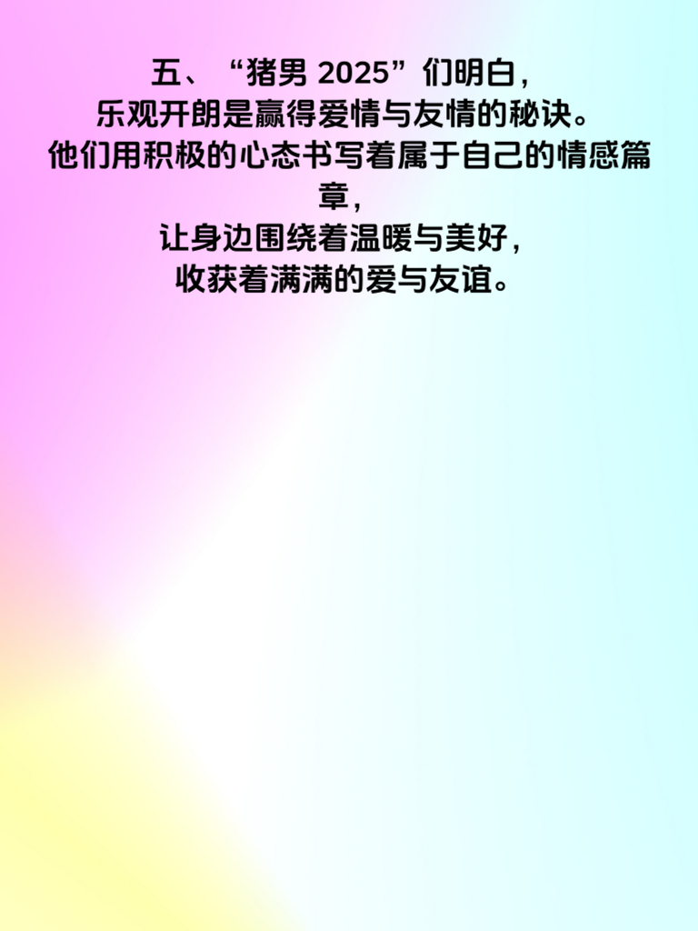 一、在爱情与友情的世界里,有这样一群特别的人,他们被称为“猪男2025”。这里的“猪男”并非贬义,而是一种独特的称呼,代表着那些乐观开朗、真诚坦率的男生。 二、乐观开朗是他们最大的魅力。他们总是带着灿烂的笑容,能迅速驱散周围的阴霾。无论是面对心仪的女生,还是结交新的朋友,这份乐观都像一块强大的磁铁,吸引着他人靠近。 三、追求女生时,他们从不扭捏。大大方方地展示自己的喜好,分享生活中的趣事。用乐观的态度面对相处中的小摩擦,把每一次问题都转化为增进感情的契机。 四、在友情方面,他们更是真诚相待。不耍心眼,不玩套路,以真心换真心。遇到朋友困难,毫不犹豫伸出援手,用乐观的精神鼓励朋友走出困境。 五、“猪男2025”们明白,乐观开朗是赢得爱情与友情的秘诀。他们用积极的心态书写着属于自己的情感篇章,让身边围绕着温暖与美好,收获着满满的爱与友谊。