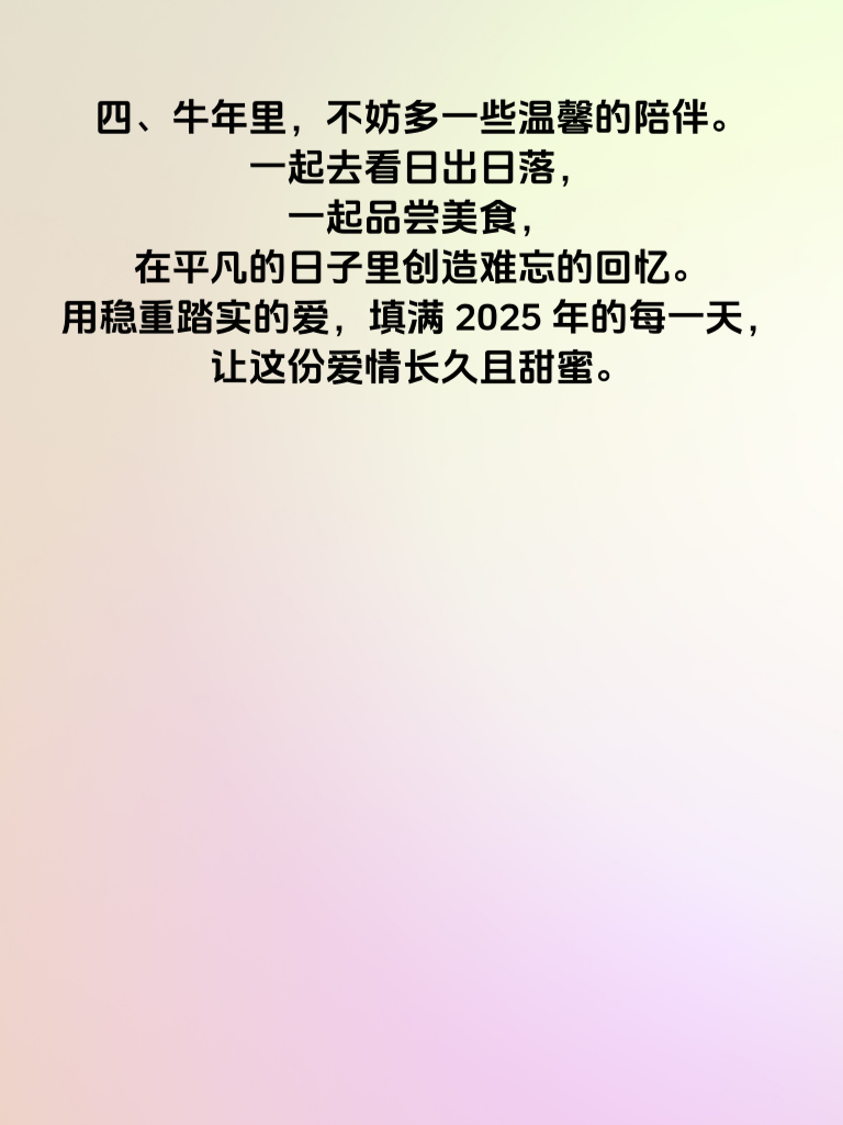 一、2025 年的牛年,对于情侣而言,是充满意义的一年。在这一年里,稳重踏实将成为爱情的基石。女生往往渴望一份能给予她安全感的感情,而男生的稳重踏实就是最好的定心丸。 二、追求女生时,要学会用行动证明自己的靠谱。比如,答应她的事情一定要做到,不轻易许下空头承诺。遇到问题时,保持冷静,沉稳地分析解决,让她看到你处理事情的能力。 三、共同经营幸福爱情,意味着要相互理解与包容。在生活中,尊重彼此的想法和选择,不强行要求对方改变。一起面对生活的酸甜苦辣,在困难面前携手共进。 四、牛年里,不妨多一些温馨的陪伴。一起去看日出日落,一起品尝美食,在平凡的日子里创造难忘的回忆。用稳重踏实的爱,填满 2025 年的每一天,让这份爱情长久且甜蜜。