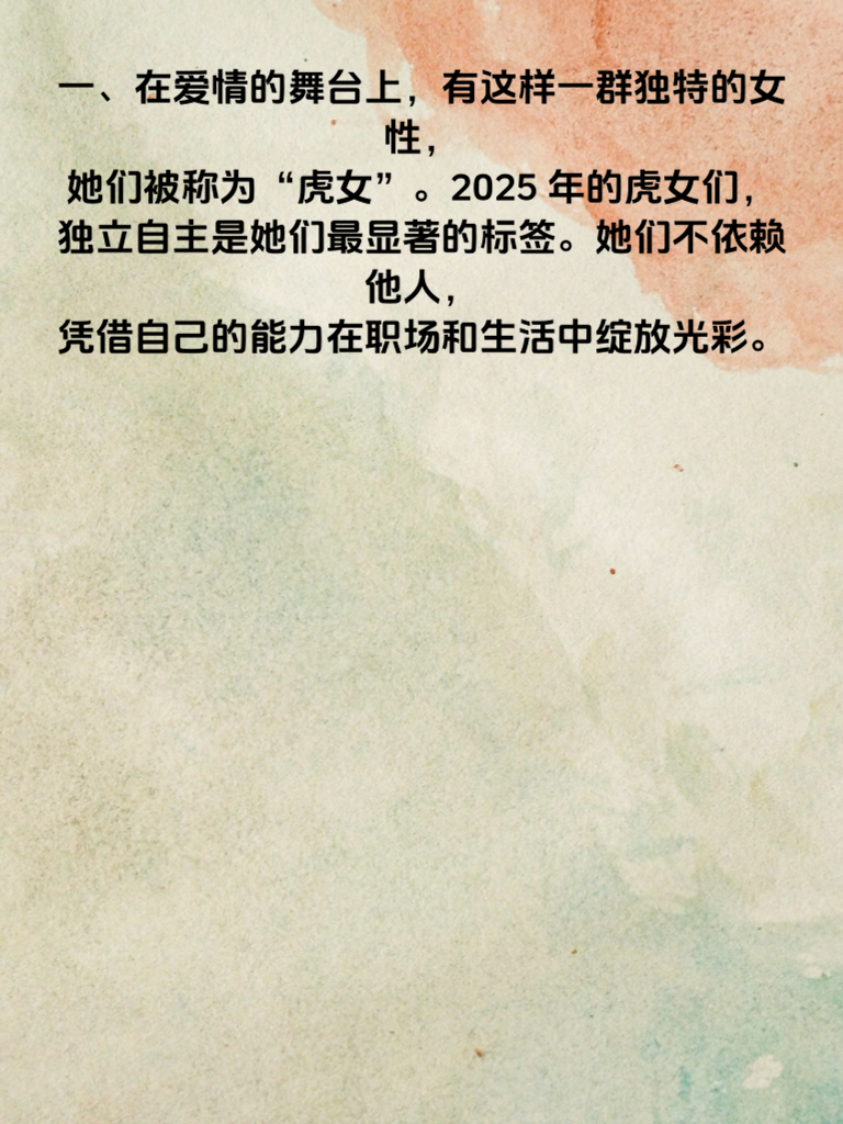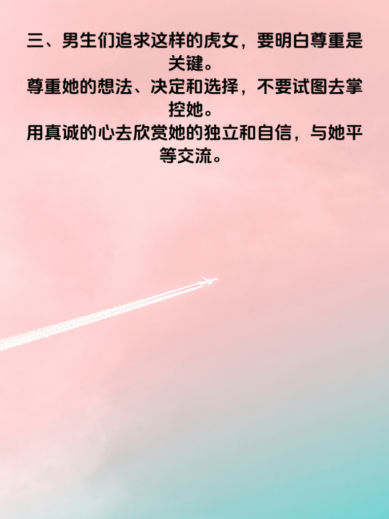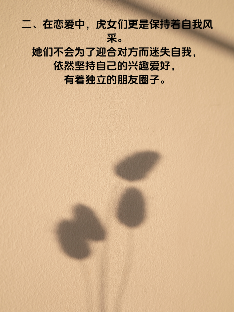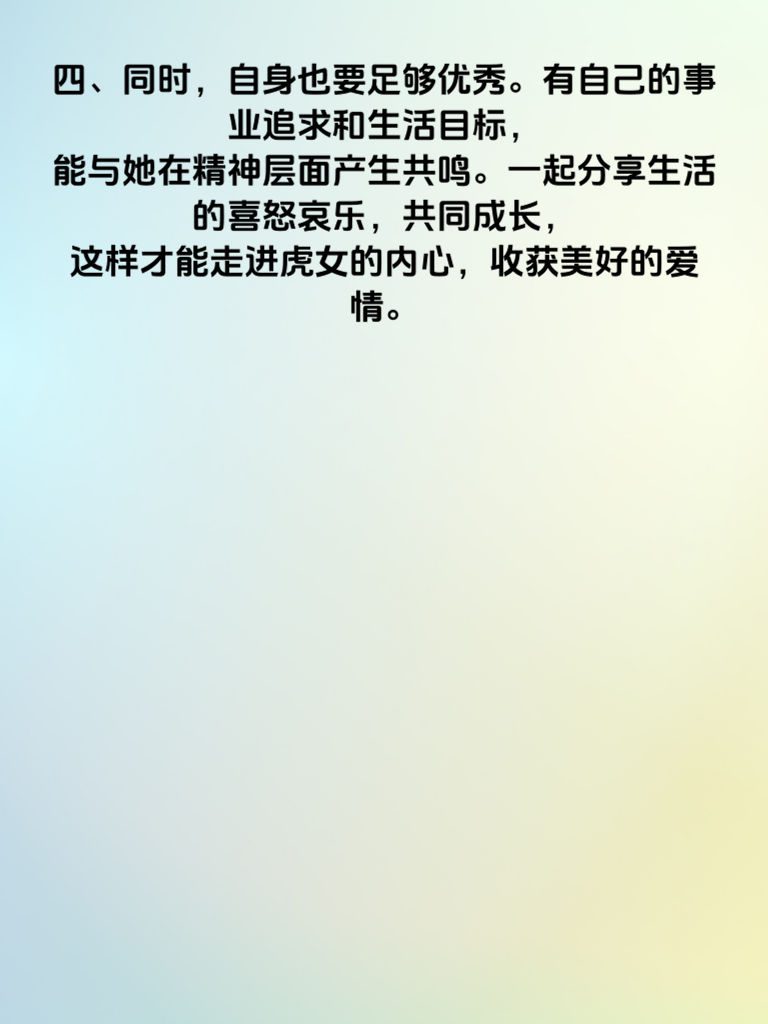 一、在爱情的舞台上,有这样一群独特的女性,她们被称为“虎女”。2025年的虎女们,独立自主是她们最显著的标签。她们不依赖他人,凭借自己的能力在职场和生活中绽放光彩。 二、在恋爱中,虎女们更是保持着自我风采。她们不会为了迎合对方而迷失自我,依然坚持自己的兴趣爱好,有着独立的朋友圈子。 三、男生们追求这样的虎女,要明白尊重是关键。尊重她的想法、决定和选择,不要试图去掌控她。用真诚的心去欣赏她的独立和自信,与她平等交流。 四、同时,自身也要足够优秀。有自己的事业追求和生活目标,能与她在精神层面产生共鸣。一起分享生活的喜怒哀乐,共同成长,这样才能走进虎女的内心,收获美好的爱情。
