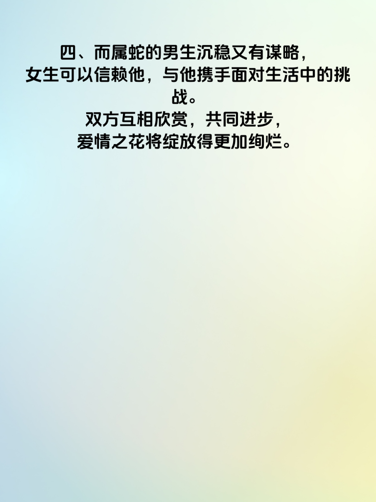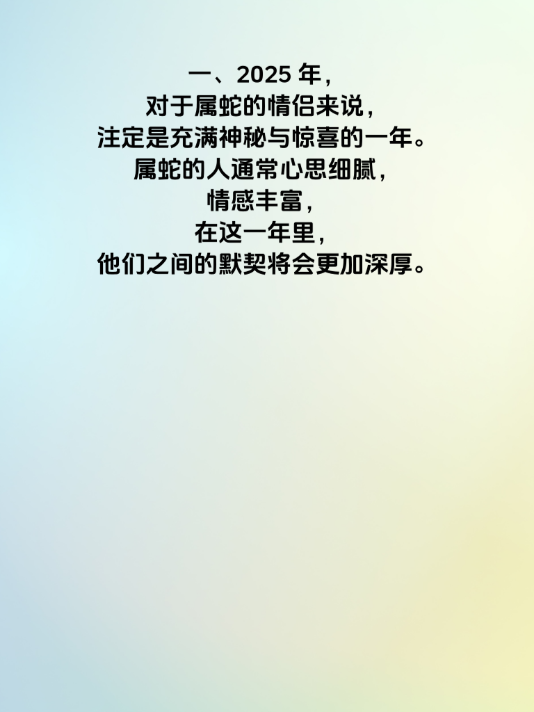 一、2025 年,对于属蛇的情侣来说,注定是充满神秘与惊喜的一年。属蛇的人通常心思细腻,情感丰富,在这一年里,他们之间的默契将会更加深厚。 二、神秘的气息围绕着他们,让彼此更加好奇与吸引。他们懂得在相处中保持适度的距离,给对方空间去思考和成长,这种智慧的相处方式,让爱情更加稳固。 三、在共同探索爱情奥秘的道路上,他们会发现彼此的闪光点。属蛇的女生敏感且聪慧,男生要学会倾听她的心声,给予她足够的理解和支持。 四、而属蛇的男生沉稳又有谋略,女生可以信赖他,与他携手面对生活中的挑战。双方互相欣赏,共同进步,爱情之花将绽放得更加绚烂。 五、2025 年,属蛇情侣将凭借着神秘的默契,在爱情的旅程中书写属于他们的美好篇章,共同领略爱情的无尽奥秘。