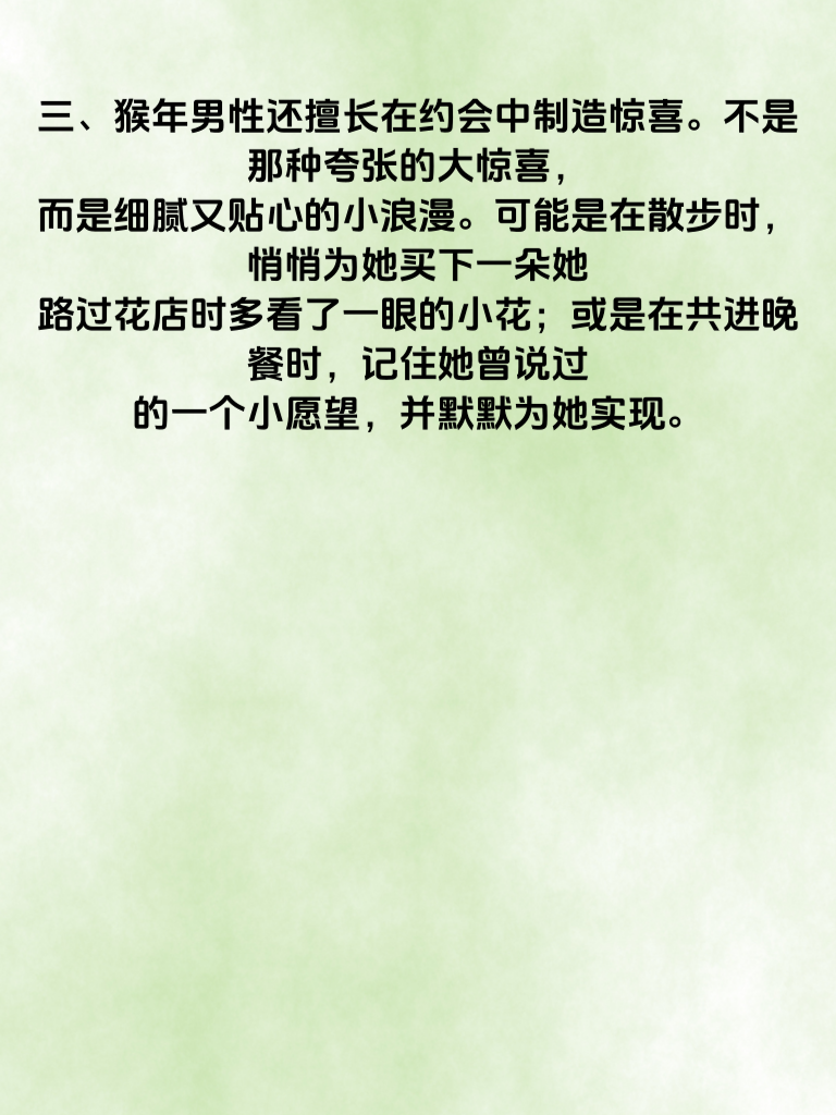 一、2025 年,猴年的男性似乎被赋予了一种独特的机智,在恋爱中总能凭借智慧出奇制胜。他们懂得用心去观察心仪女生的喜好,从日常的点滴中捕捉她的兴趣点,让每一次的交流都能深入她的心。 二、比如,当了解到她热爱阅读,下次见面时,便能不经意地提及一本最近读过且觉得很棒的书,展开一场有趣的讨论。这种投其所好的小技巧,瞬间就能拉近彼此的距离。 三、猴年男性还擅长在约会中制造惊喜。不是那种夸张的大惊喜,而是细腻又贴心的小浪漫。可能是在散步时,悄悄为她买下一朵她路过花店时多看了一眼的小花;或是在共进晚餐时,记住她曾说过的一个小愿望,并默默为她实现。 四、他们深知沟通的重要性,会耐心倾听女生的想法和感受,用真诚的眼神和温暖的回应给予她安全感。而且,在表达自己时,也能巧妙地展现自己的优点与魅力,却又不会显得过于自负。正是这些机智的表现,让他们在恋爱中如鱼得水,总能收获美好的爱情。