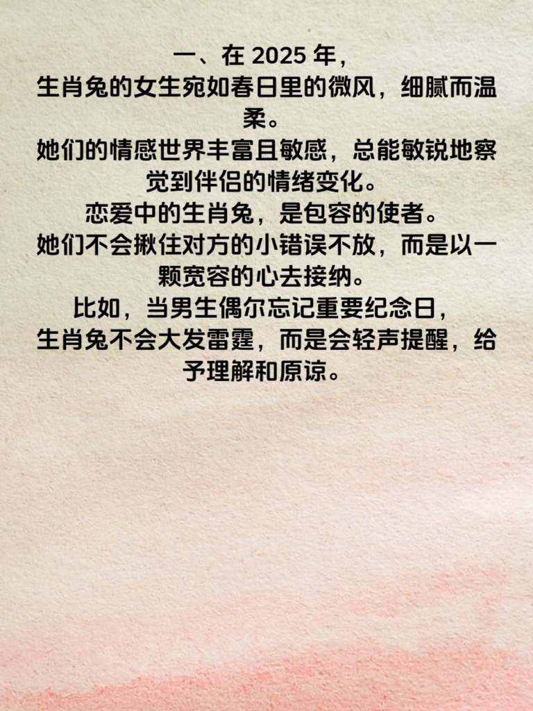 一、在 2025 年,生肖兔的女生宛如春日里的微风,细腻而温柔。她们的情感世界丰富且敏感,总能敏锐地察觉到伴侣的情绪变化。恋爱中的生肖兔,是包容的使者。她们不会揪住对方的小错误不放,而是以一颗宽容的心去接纳。比如,当男生偶尔忘记重要纪念日,生肖兔不会大发雷霆,而是会轻声提醒,给予理解和原谅。 二、生肖兔懂得换位思考,能站在男生的角度去感受问题。在面对分歧时,她们不会一味坚持己见,而是会耐心倾听对方的想法,然后平和地表达自己的观点。这种包容与理解,让恋爱关系如沐春风。 三、她们善于用温柔的方式表达自己的需求。不会强硬地要求男生做什么,而是通过委婉的话语和贴心的举动,让男生主动想要为她们付出。生肖兔用自己的细腻与温柔,营造出甜蜜又和谐的恋爱氛围,让双方都能在这段关系中感受到无尽的温暖与爱意。