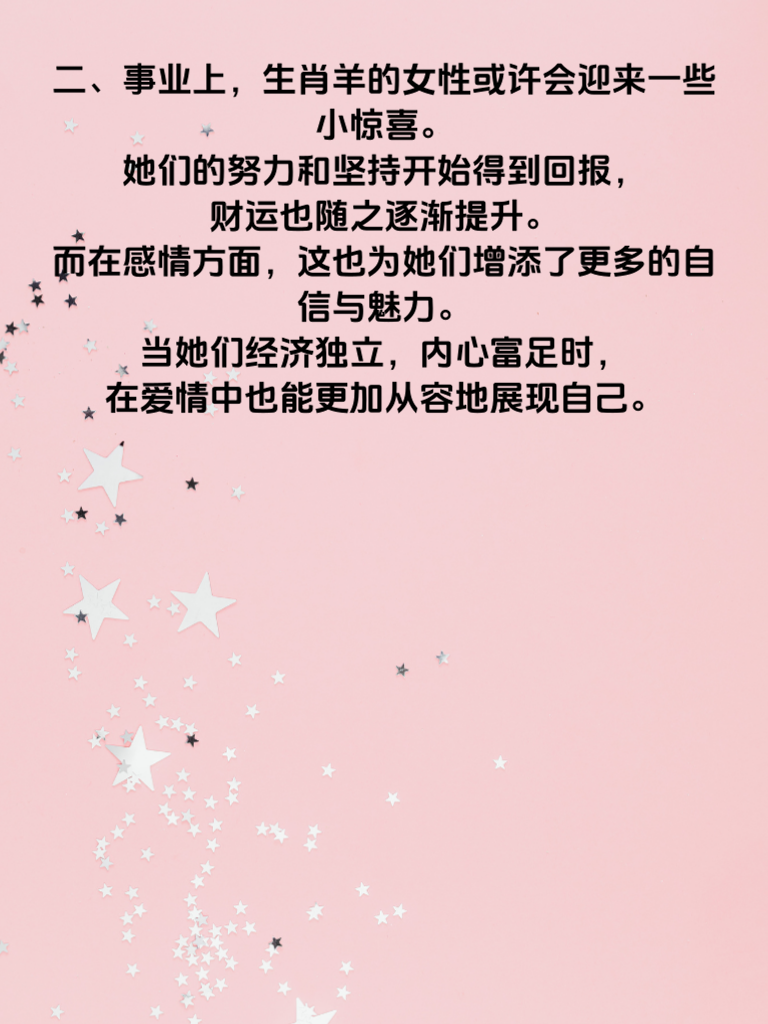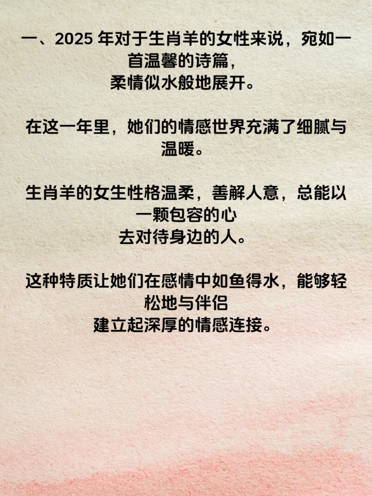 一、2025 年对于生肖羊的女性来说,宛如一首温馨的诗篇,柔情似水般地展开。在这一年里,她们的情感世界充满了细腻与温暖。生肖羊的女生性格温柔,善解人意,总能以一颗包容的心去对待身边的人。这种特质让她们在感情中如鱼得水,能够轻松地与伴侣建立起深厚的情感连接。 二、事业上,生肖羊的女性或许会迎来一些小惊喜。她们的努力和坚持开始得到回报,财运也随之逐渐提升。而在感情方面,这也为她们增添了更多的自信与魅力。当她们经济独立,内心富足时,在爱情中也能更加从容地展现自己。 三、在追求爱情的道路上,生肖羊的女生不妨继续保持自己的温柔本色。用细腻的关怀去打动心仪的男生,倾听他的心声,给予他支持与鼓励。同时,也要学会在感情中保持自我,不迷失自我。相信在 2025 年,生肖羊的女生定能收获一份美满的爱情,让财情双收成为现实,书写属于自己的幸福篇章。