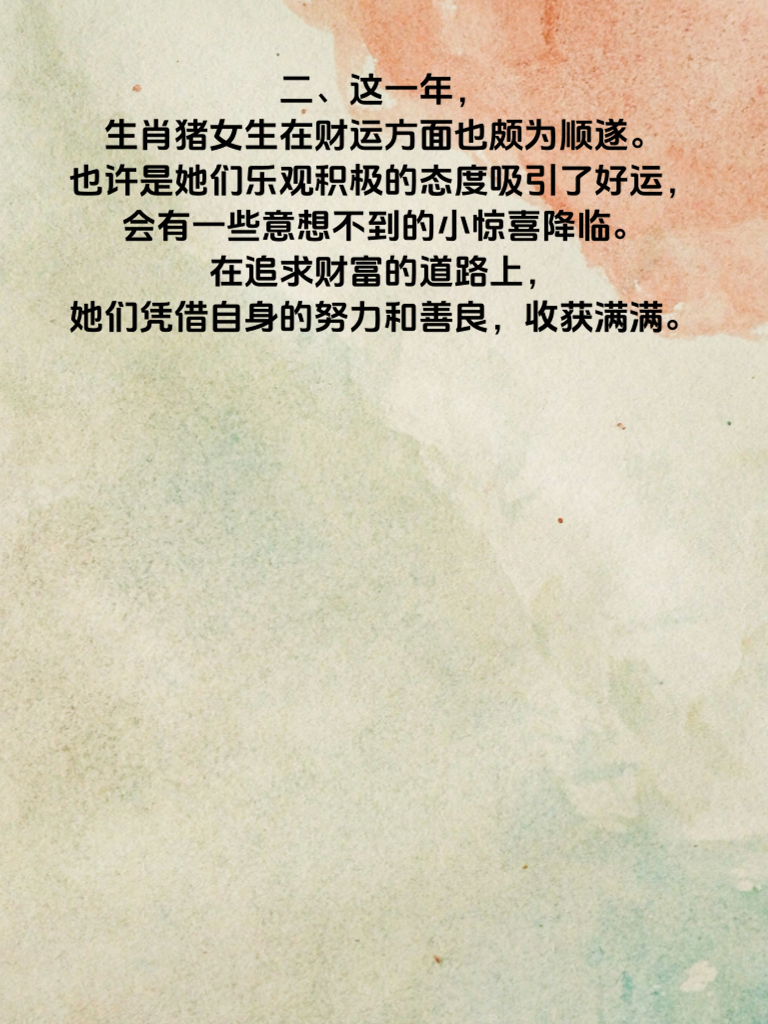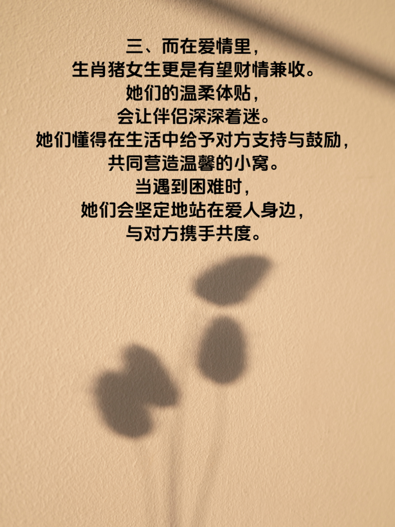 一、2025 年,对于生肖猪的女生来说,注定是福满年。她们那憨厚可爱的模样,总能给人带来无尽温暖。在感情中,生肖猪女生真诚且坦率,不擅长心机算计,用最纯粹的心去对待爱人。 二、这一年,生肖猪女生在财运方面也颇为顺遂。也许是她们乐观积极的态度吸引了好运,会有一些意想不到的小惊喜降临。在追求财富的道路上,她们凭借自身的努力和善良,收获满满。 三、而在爱情里,生肖猪女生更是有望财情兼收。她们的温柔体贴,会让伴侣深深着迷。她们懂得在生活中给予对方支持与鼓励,共同营造温馨的小窝。当遇到困难时,她们会坚定地站在爱人身边,与对方携手共度。 四、生肖猪女生在 2025 年,就像一颗温暖的小太阳,散发着独特的魅力。无论是财运还是爱情,都将围绕着她们绽放光彩,让她们乐陶陶地享受这美好的一年。