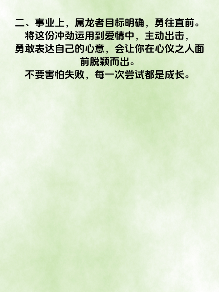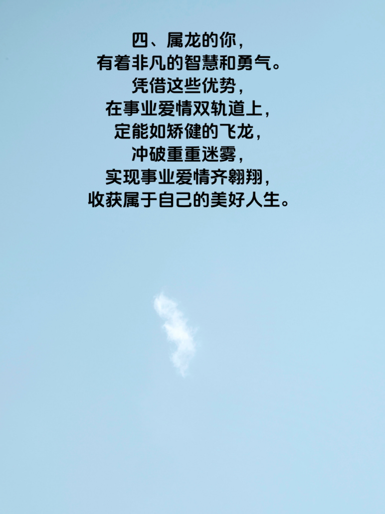 一、2025 年属龙的朋友们,仿佛生来就带着高瞻远瞩的特质,在事业与爱情的天空中,有着翱翔的无限潜力。龙年出生的你们,自信且富有领导力,这种独特的魅力在追求爱情时,往往能吸引众多目光。 二、事业上,属龙者目标明确,勇往直前。将这份冲劲运用到爱情中,主动出击,勇敢表达自己的心意,会让你在心仪之人面前脱颖而出。不要害怕失败,每一次尝试都是成长。 三、在爱情里,高瞻远瞩意味着有长远的眼光。了解自己真正想要的伴侣,不被一时的冲动迷惑。同时,也要懂得包容和理解对方的不足,携手共同成长。 四、属龙的你,有着非凡的智慧和勇气。凭借这些优势,在事业爱情双轨道上,定能如矫健的飞龙,冲破重重迷雾,实现事业爱情齐翱翔,收获属于自己的美好人生。
