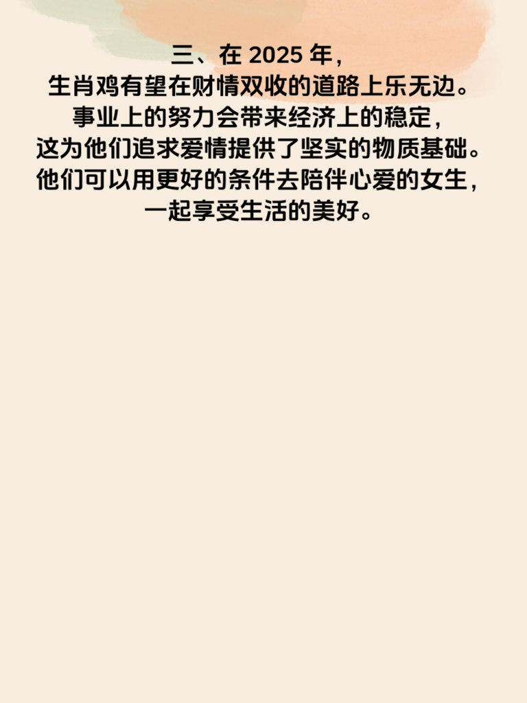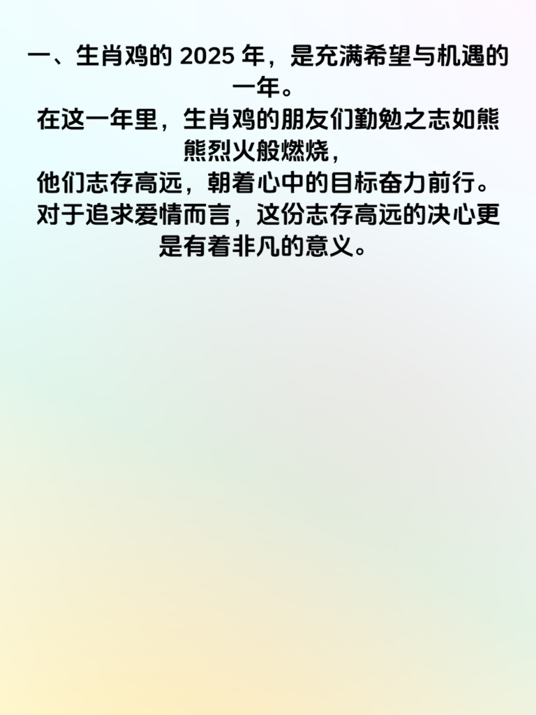 一、生肖鸡的 2025 年,是充满希望与机遇的一年。在这一年里,生肖鸡的朋友们勤勉之志如熊熊烈火般燃烧,他们志存高远,朝着心中的目标奋力前行。对于追求爱情而言,这份志存高远的决心更是有着非凡的意义。 二、当生肖鸡以勤勉的姿态投入到生活中时,他们的魅力也在不断散发。他们对待感情认真负责,在追求女生的道路上,会用心去了解对方的喜好,用实际行动去关心呵护。这种真诚与用心,往往能打动女生的芳心。 三、在 2025 年,生肖鸡有望在财情双收的道路上乐无边。事业上的努力会带来经济上的稳定,这为他们追求爱情提供了坚实的物质基础。他们可以用更好的条件去陪伴心爱的女生,一起享受生活的美好。 四、生肖鸡在追求女生时,懂得适时展现自己的才华和优势。他们积极进取的精神会感染身边的人,让女生看到他们的潜力和未来。凭借着 2025 年的勤勉之志,生肖鸡在爱情的道路上定能收获满满,与心爱的人携手共度幸福时光。