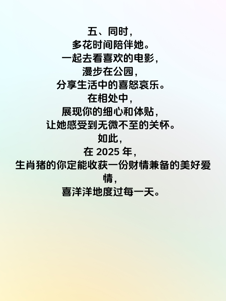 一、2025 年对于生肖猪的朋友们来说,可谓是福运满满。在这一年,爱情也会如同福满园一般,充满甜蜜与惊喜。生肖猪的你,本身就有着温和善良的性格,这是吸引异性的重要特质。 二、要想在感情中收获更多幸福,首先得保持自信。相信自己的魅力,不要因为一些小缺点就妄自菲薄。当你自信地展现自己时,会散发出独特的光芒。 三、在追求女生的过程中,真诚是必杀技。生肖猪的你本就真诚待人,那就将这份真诚毫无保留地展现出来。让对方感受到你是真心想要走进她的世界,而不是虚情假意。 四、2025 年的生肖猪在财运方面也有不错的运势,这也为感情增添了助力。可以偶尔为心仪的女生准备一些小惊喜,不需要太贵重,但要用心,比如一份她喜欢的小礼物,一顿精心准备的晚餐。 五、同时,多花时间陪伴她。一起去看喜欢的电影,漫步在公园,分享生活中的喜怒哀乐。在相处中,展现你的细心和体贴,让她感受到无微不至的关怀。如此,在 2025 年,生肖猪的你定能收获一份财情兼备的美好爱情,喜洋洋地度过每一天。