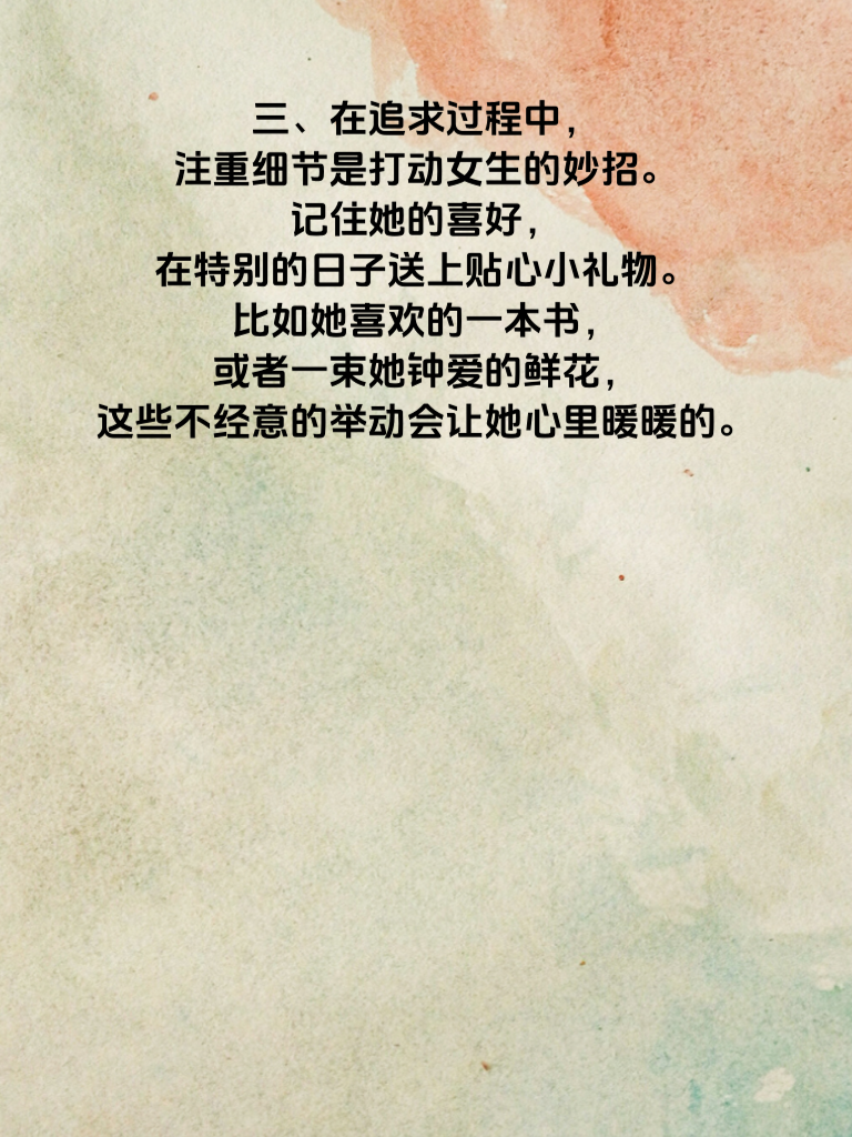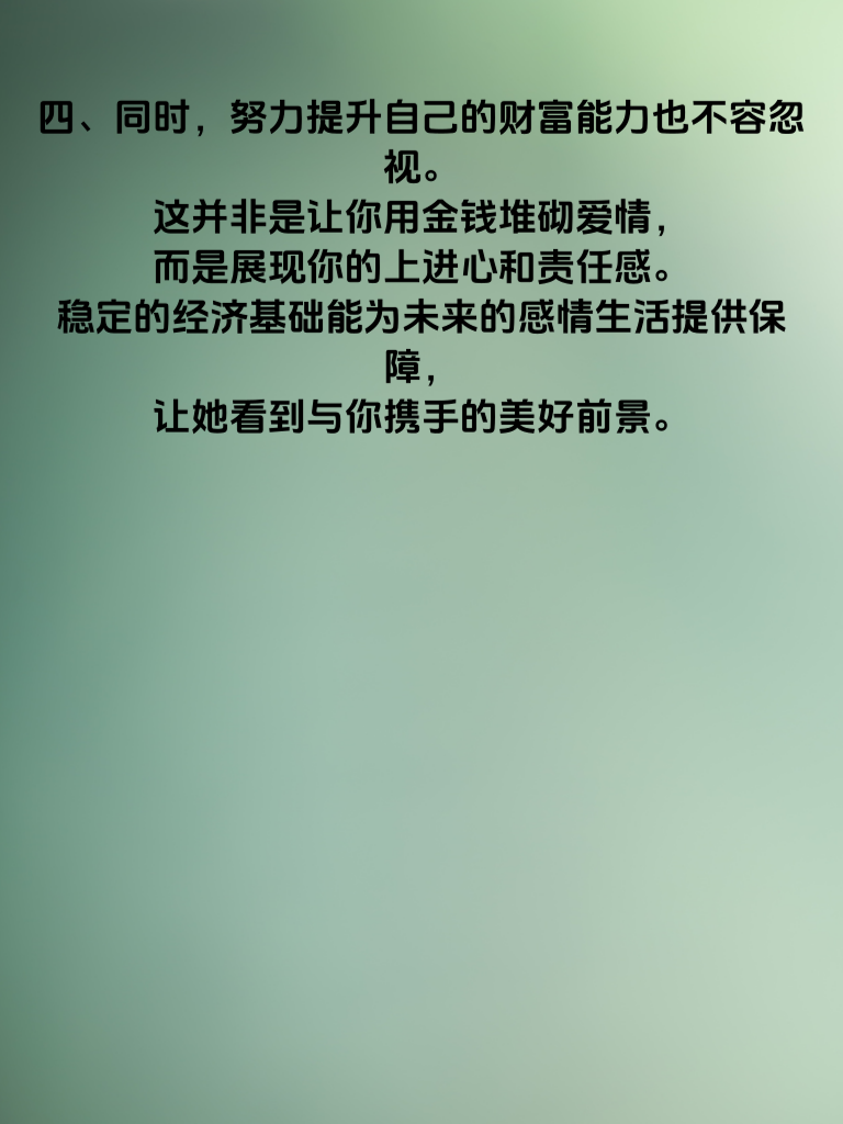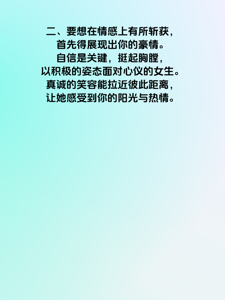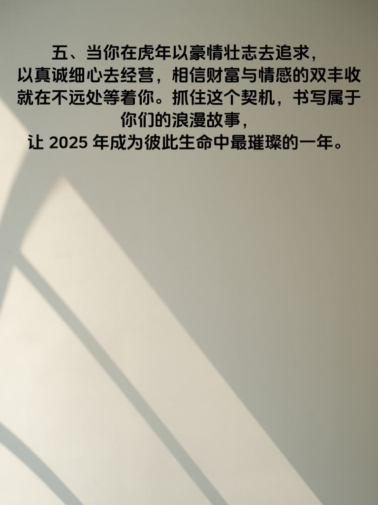 一、2025 年的虎年,注定是充满豪情壮志的一年。在这个年份里,不仅事业上有望大展拳脚,收获财富,情感世界也将迎来别样的精彩。对于追求爱情的男士们来说,这是一个绝佳的时机,去勇敢追寻那份属于自己的情感丰收。 二、要想在情感上有所斩获,首先得展现出你的豪情。自信是关键,挺起胸膛,以积极的姿态面对心仪的女生。真诚的笑容能拉近彼此距离,让她感受到你的阳光与热情。 三、在追求过程中,注重细节是打动女生的妙招。记住她的喜好,在特别的日子送上贴心小礼物。比如她喜欢的一本书,或者一束她钟爱的鲜花,这些不经意的举动会让她心里暖暖的。 四、同时,努力提升自己的财富能力也不容忽视。这并非是让你用金钱堆砌爱情,而是展现你的上进心和责任感。稳定的经济基础能为未来的感情生活提供保障,让她看到与你携手的美好前景。 五、当你在虎年以豪情壮志去追求,以真诚细心去经营,相信财富与情感的双丰收就在不远处等着你。抓住这个契机,书写属于你们的浪漫故事,让 2025 年成为彼此生命中最璀璨的一年。