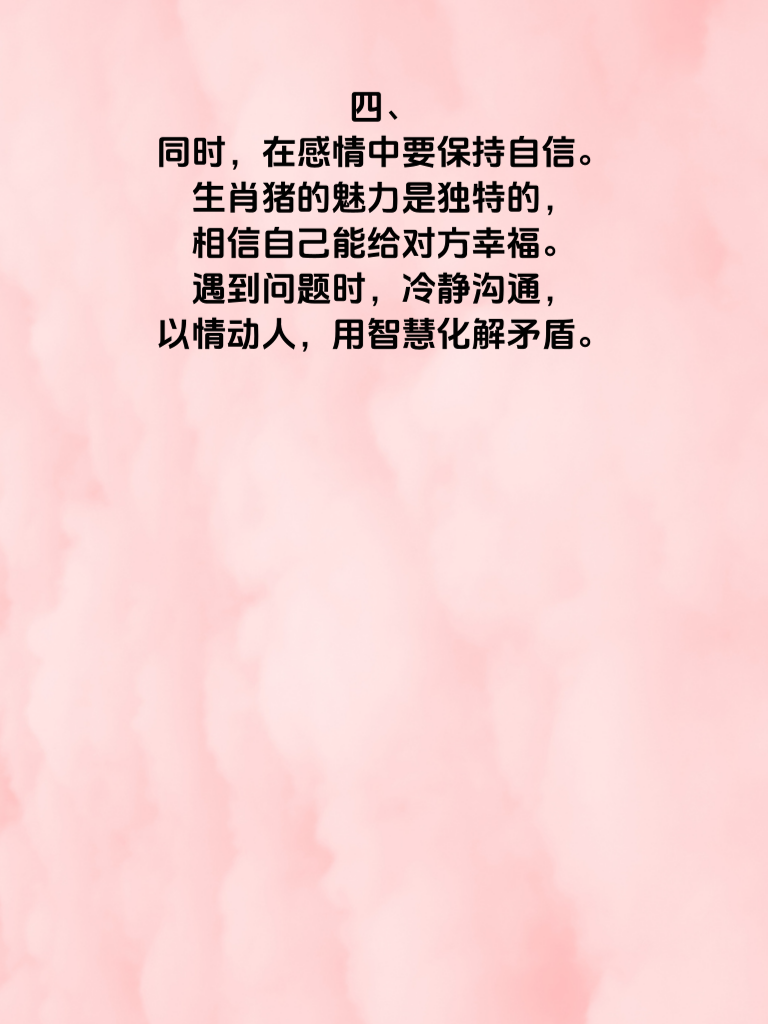 一、2025 年,对于生肖猪的朋友们来说,可谓是福运满满,财情双收。在感情的世界里,这一年也是充满了无限可能。生肖猪的你,本就有着温柔善良的内心,对感情真诚且执着。 二、在追求爱情的道路上,要充分发挥自己的优势。用你的温暖去呵护对方,让她感受到无微不至的关怀。比如,记住她的喜好,在特殊的日子送上贴心的小礼物。 三、财运的亨通也会为感情助力。有了一定的物质基础,能为你们的相处增添更多美好。可以一起去看更广阔的世界,体验更多浪漫的旅程。 四、同时,在感情中要保持自信。生肖猪的魅力是独特的,相信自己能给对方幸福。遇到问题时,冷静沟通,以情动人,用智慧化解矛盾。 五、2025 年,愿生肖猪的你,福满爱情之门,收获满满的甜蜜。让财情兼备成为你爱情路上的亮丽风景,喜盈生活的每一个角落。