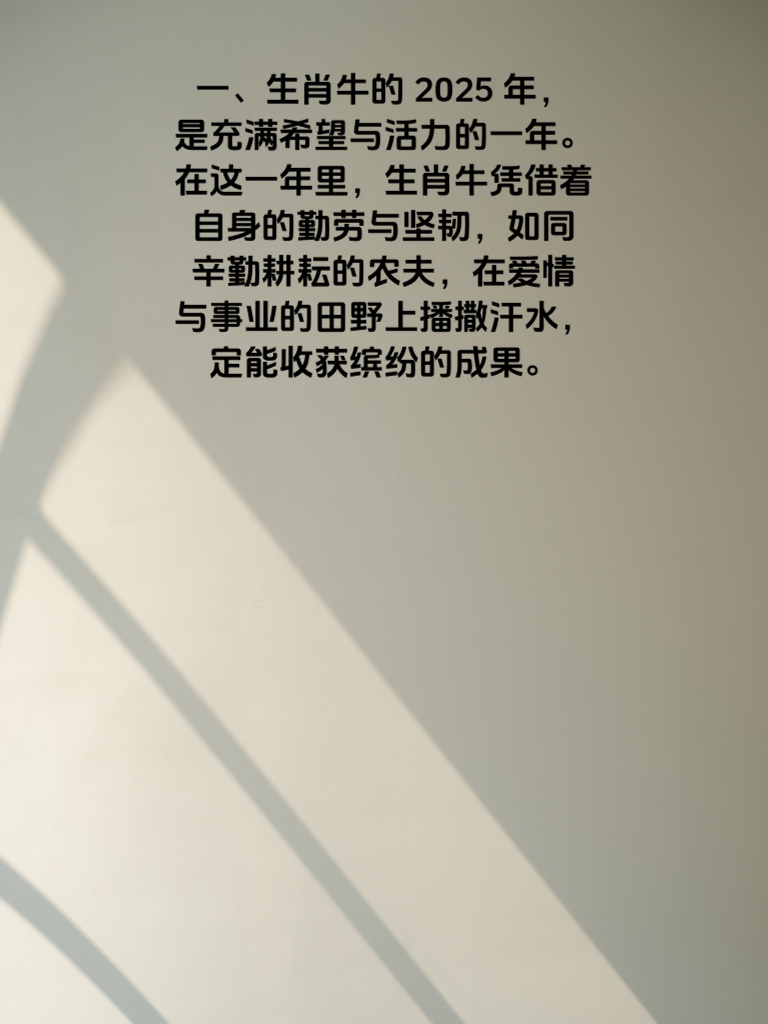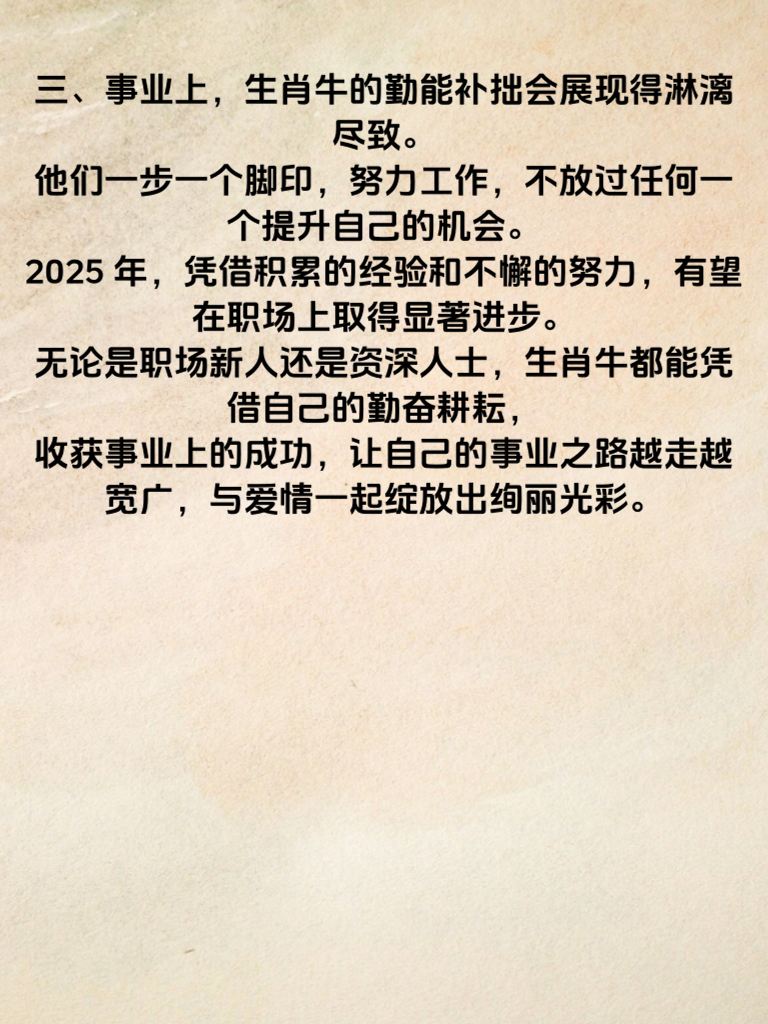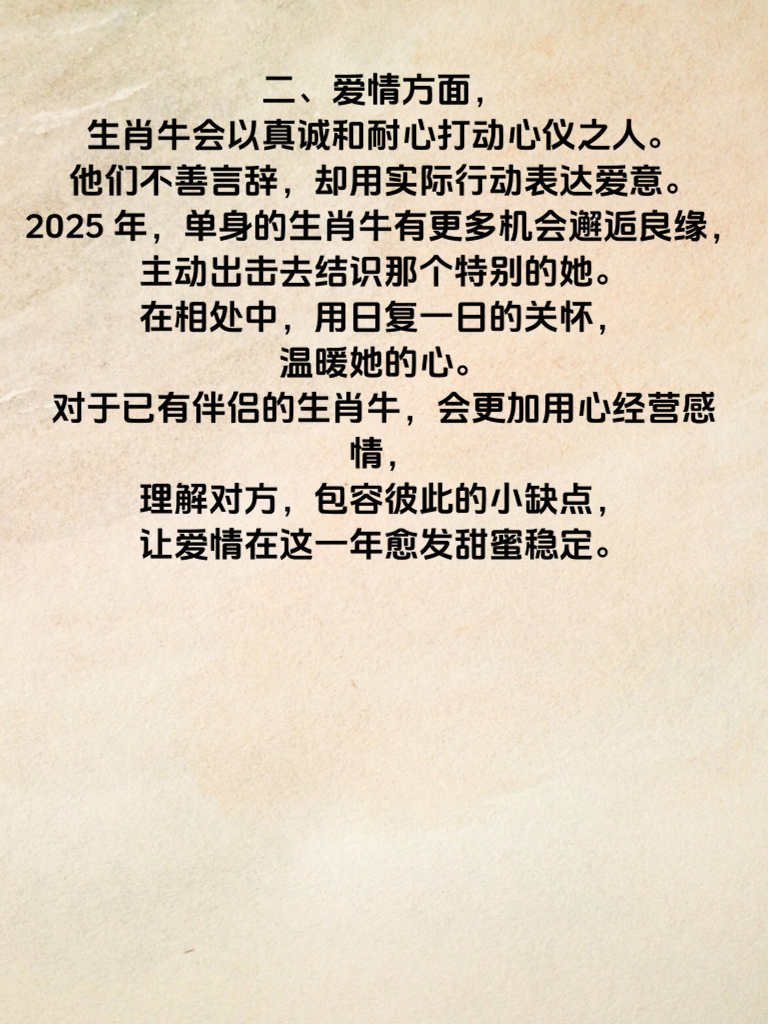 一、生肖牛的2025年,是充满希望与活力的一年。在这一年里,生肖牛凭借着自身的勤劳与坚韧,如同辛勤耕耘的农夫,在爱情与事业的田野上播撒汗水,定能收获缤纷的成果。 二、爱情方面,生肖牛会以真诚和耐心打动心仪之人。他们不善言辞,却用实际行动表达爱意。2025年,单身的生肖牛有更多机会邂逅良缘,主动出击去结识那个特别的她。在相处中,用日复一日的关怀,温暖她的心。对于已有伴侣的生肖牛,会更加用心经营感情,理解对方,包容彼此的小缺点,让爱情在这一年愈发甜蜜稳定。 三、事业上,生肖牛的勤能补拙会展现得淋漓尽致。他们一步一个脚印,努力工作,不放过任何一个提升自己的机会。2025年,凭借积累的经验和不懈的努力,有望在职场上取得显著进步。无论是职场新人还是资深人士,生肖牛都能凭借自己的勤奋耕耘,收获事业上的成功,让自己的事业之路越走越宽广,与爱情一起绽放出绚丽光彩。