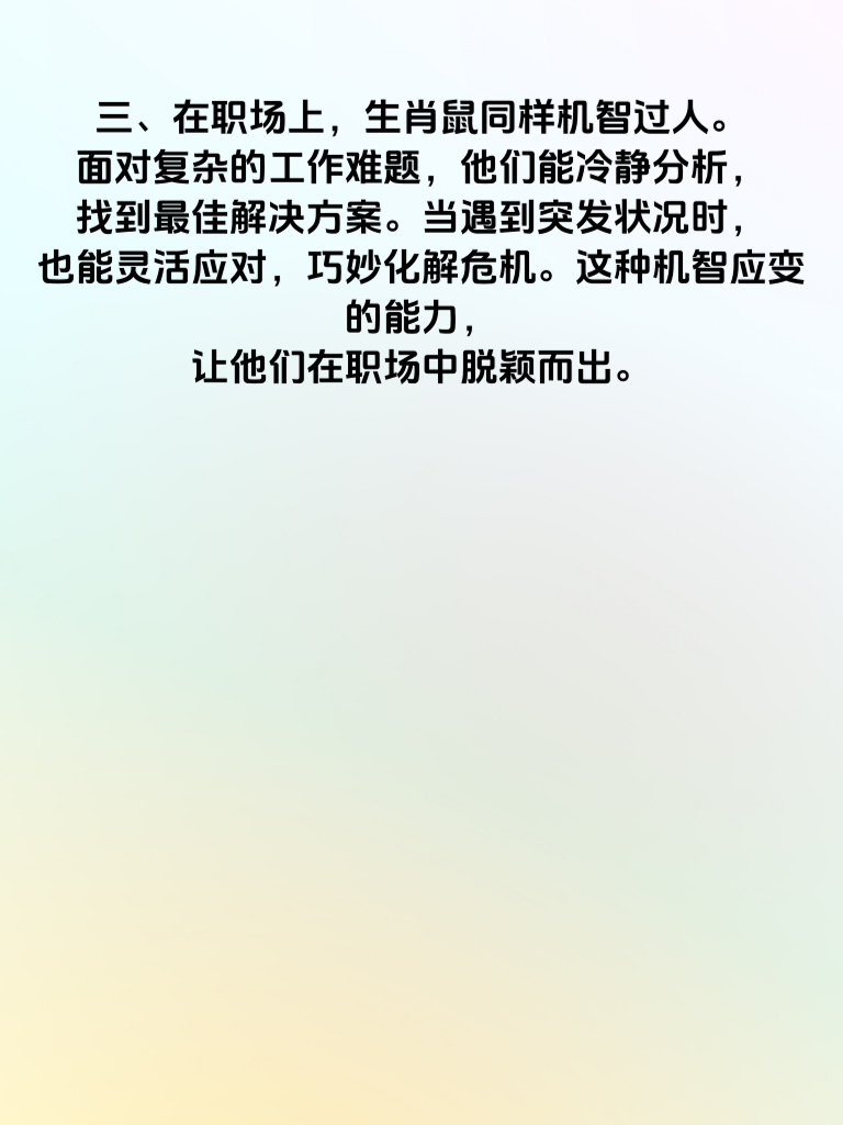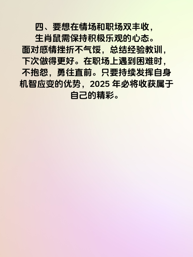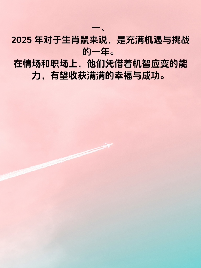 一、2025 年对于生肖鼠来说,是充满机遇与挑战的一年。在情场和职场上,他们凭借着机智应变的能力,有望收获满满的幸福与成功。 二、生肖鼠的人向来聪明伶俐,在情场中更是如此。他们善于洞察对方的心思,能迅速捕捉到心仪之人的喜好。比如,了解到对方喜欢阅读,就可以精心挑选一本适合的书籍作为约会礼物,用这份贴心赢得好感。 三、在职场上,生肖鼠同样机智过人。面对复杂的工作难题,他们能冷静分析,找到最佳解决方案。当遇到突发状况时,也能灵活应对,巧妙化解危机。这种机智应变的能力,让他们在职场中脱颖而出。 四、要想在情场和职场双丰收,生肖鼠需保持积极乐观的心态。面对感情挫折不气馁,总结经验教训,下次做得更好。在职场上遇到困难时,不抱怨,勇往直前。只要持续发挥自身机智应变的优势,2025 年必将收获属于自己的精彩。