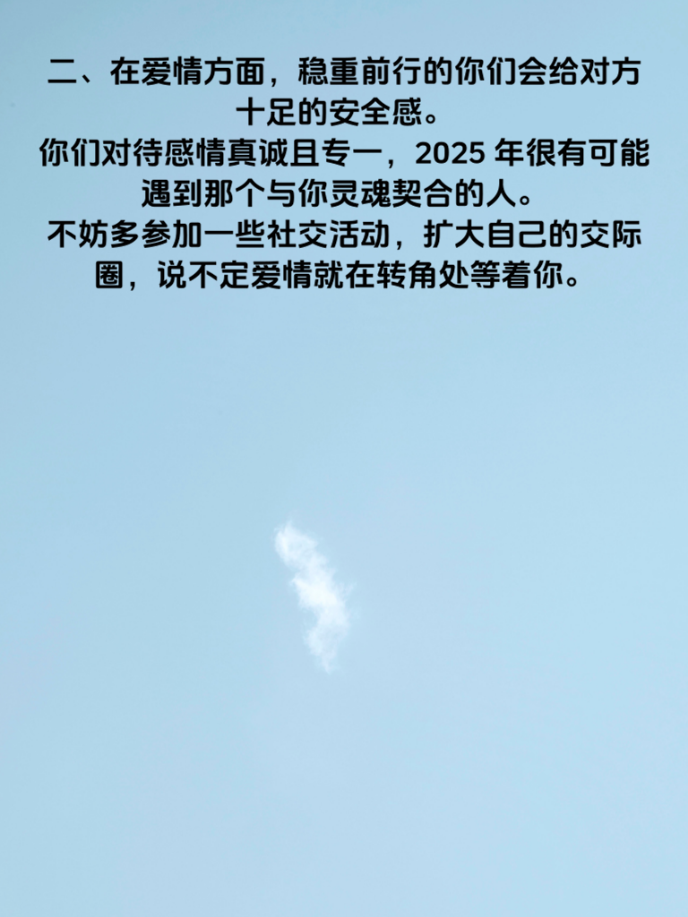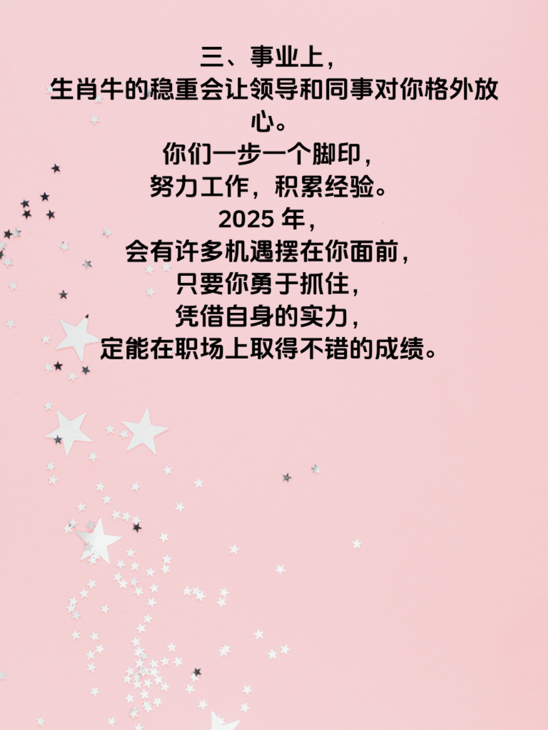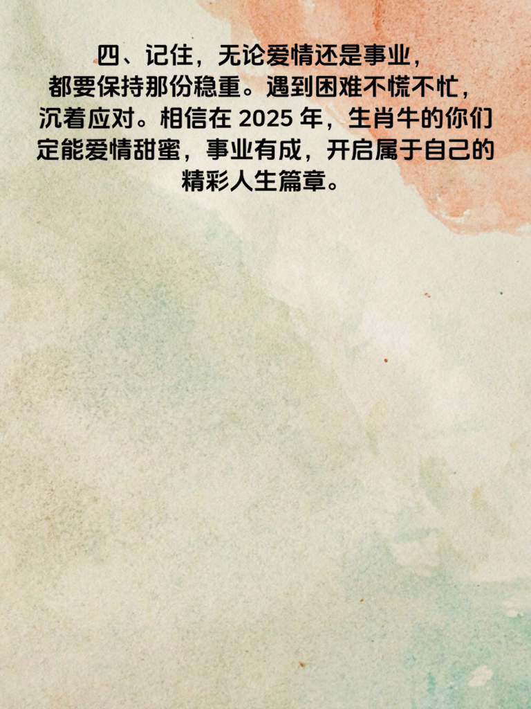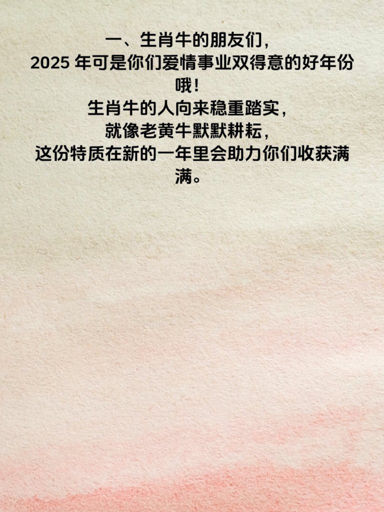 一、生肖牛的朋友们,2025 年可是你们爱情事业双得意的好年份哦!生肖牛的人向来稳重踏实,就像老黄牛默默耕耘,这份特质在新的一年里会助力你们收获满满。 二、在爱情方面,稳重前行的你们会给对方十足的安全感。你们对待感情真诚且专一,2025 年很有可能遇到那个与你灵魂契合的人。不妨多参加一些社交活动,扩大自己的交际圈,说不定爱情就在转角处等着你。 三、事业上,生肖牛的稳重会让领导和同事对你格外放心。你们一步一个脚印,努力工作,积累经验。2025 年,会有许多机遇摆在你面前,只要你勇于抓住,凭借自身的实力,定能在职场上取得不错的成绩。 四、记住,无论爱情还是事业,都要保持那份稳重。遇到困难不慌不忙,沉着应对。相信在 2025 年,生肖牛的你们定能爱情甜蜜,事业有成,开启属于自己的精彩人生篇章。
