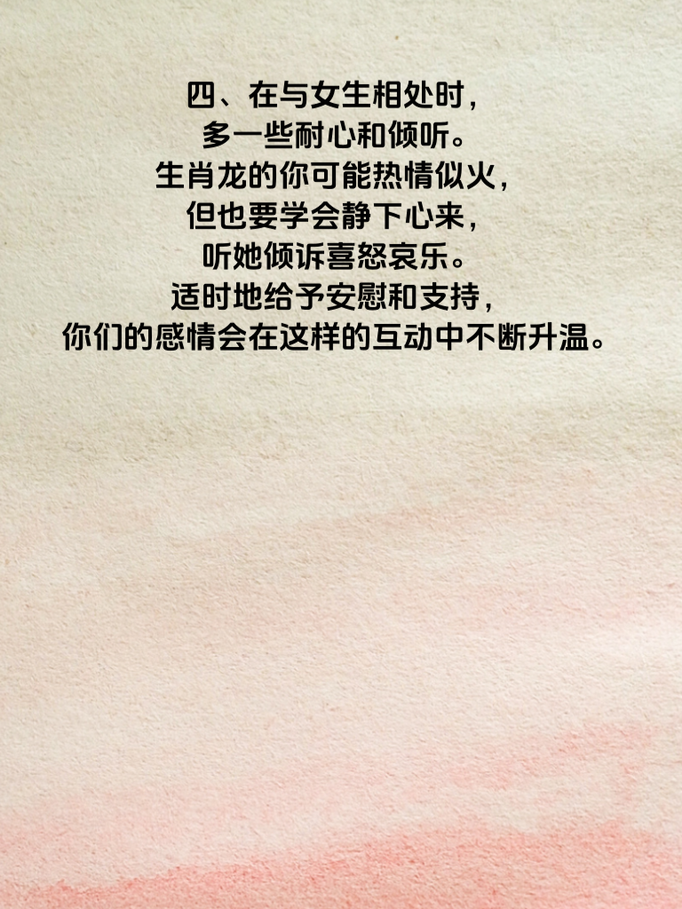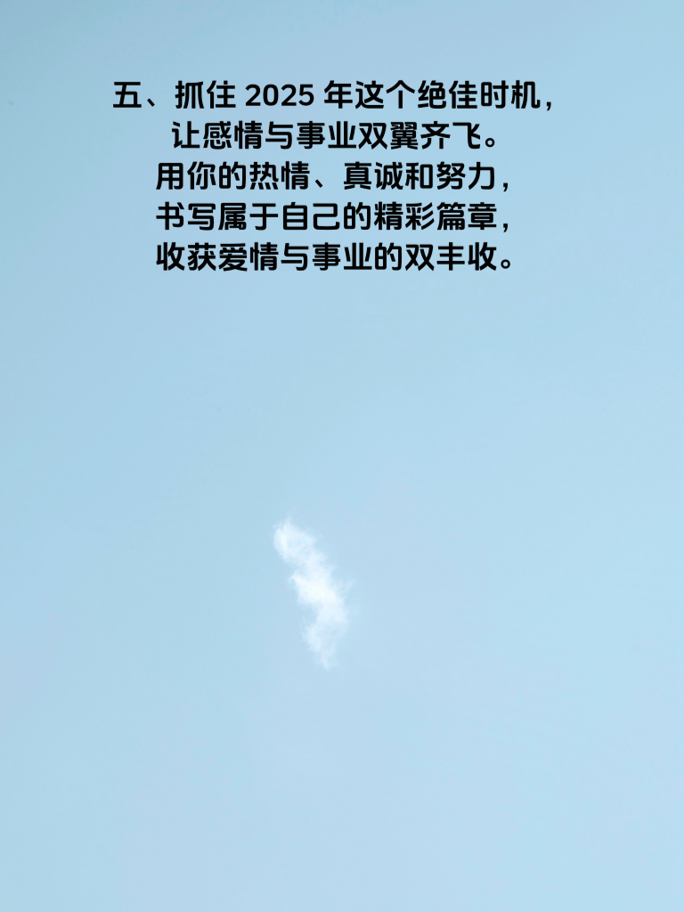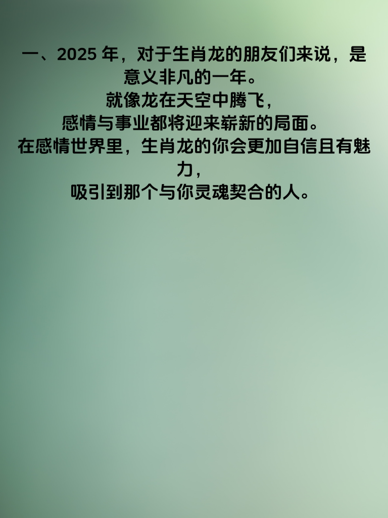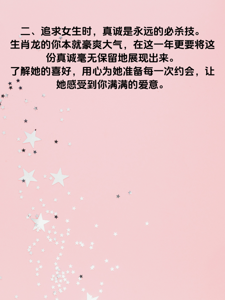 一、2025年,对于生肖龙的朋友们来说,是意义非凡的一年。就像龙在天空中腾飞,感情与事业都将迎来崭新的局面。在感情世界里,生肖龙的你会更加自信且有魅力,吸引到那个与你灵魂契合的人。 二、追求女生时,真诚是永远的必杀技。生肖龙的你本就豪爽大气,在这一年更要将这份真诚毫无保留地展现出来。了解她的喜好,用心为她准备每一次约会,让她感受到你满满的爱意。 三、事业上的腾飞也会为你的感情加分不少。当你在工作中取得成绩,那种自信和成就感会自然地散发出来。这不仅能让你更有底气去追求爱情,也会让女生看到你的上进心和潜力。 四、在与女生相处时,多一些耐心和倾听。生肖龙的你可能热情似火,但也要学会静下心来,听她倾诉喜怒哀乐。适时地给予安慰和支持,你们的感情会在这样的互动中不断升温。 五、抓住2025年这个绝佳时机,让感情与事业双翼齐飞。用你的热情、真诚和努力,书写属于自己的精彩篇章,收获爱情与事业的双丰收。