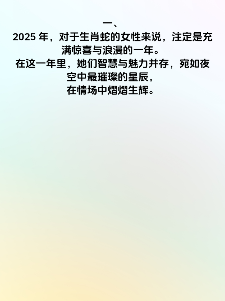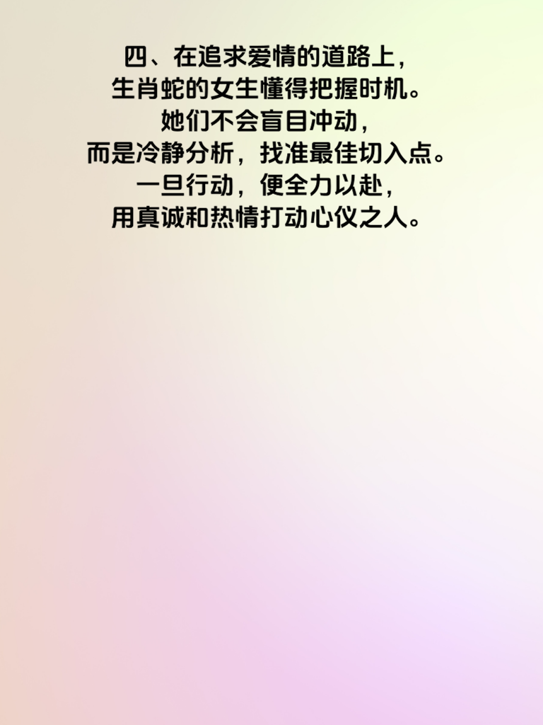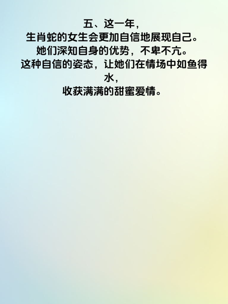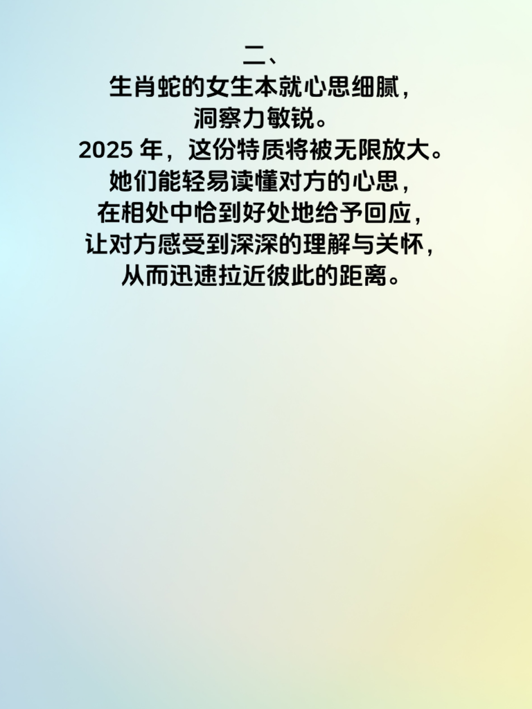 一、2025 年,对于生肖蛇的女性来说,注定是充满惊喜与浪漫的一年。在这一年里,她们智慧与魅力并存,宛如夜空中最璀璨的星辰,在情场中熠熠生辉。 二、生肖蛇的女生本就心思细腻,洞察力敏锐。2025 年,这份特质将被无限放大。她们能轻易读懂对方的心思,在相处中恰到好处地给予回应,让对方感受到深深的理解与关怀,从而迅速拉近彼此的距离。 三、智慧赋予她们独特的魅力。她们善于用巧妙的言辞表达自己的想法,总能在不经意间展现出非凡的气质。无论是在正式场合还是日常相处,都能吸引众多目光。 四、在追求爱情的道路上,生肖蛇的女生懂得把握时机。她们不会盲目冲动,而是冷静分析,找准最佳切入点。一旦行动,便全力以赴,用真诚和热情打动心仪之人。 五、这一年,生肖蛇的女生会更加自信地展现自己。她们深知自身的优势,不卑不亢。这种自信的姿态,让她们在情场中如鱼得水,收获满满的甜蜜爱情。