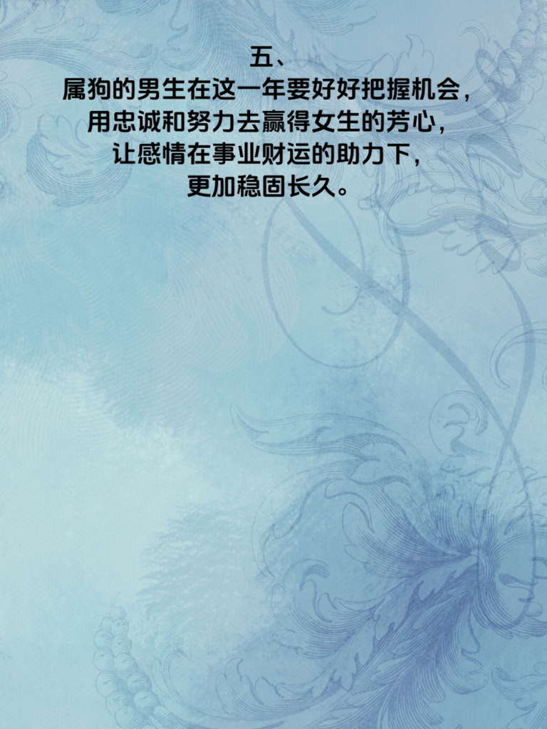 一、2025 年,生肖狗迎来了属于自己的守护年。在这一年里,属狗的朋友们在情感上有着独特的优势,忠诚不渝是他们爱情的底色。对于追求爱情的男生而言,这是绝佳的品质示范。 二、在追求女生的过程中,忠诚能让女生感受到无比的安心。当你许下承诺,就要全心全意去履行。比如每天主动报备自己的行踪,让她知道你心里有她,没有隐瞒。 三、事业财运方面,这一年生肖狗也会有不错的运势。男生可以借助这份好运,努力提升自己的事业,为未来的感情打下坚实的物质基础。 四、经济上的稳定会让女生更有安全感,也能为你们的爱情增添更多保障。情更坚不仅体现在感情的深度上,还在于面对生活压力时,双方携手共进的决心。 五、属狗的男生在这一年要好好把握机会,用忠诚和努力去赢得女生的芳心,让感情在事业财运的助力下,更加稳固长久。
