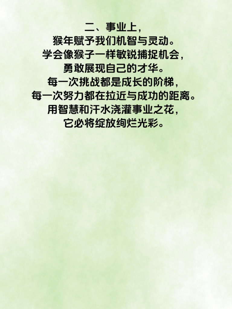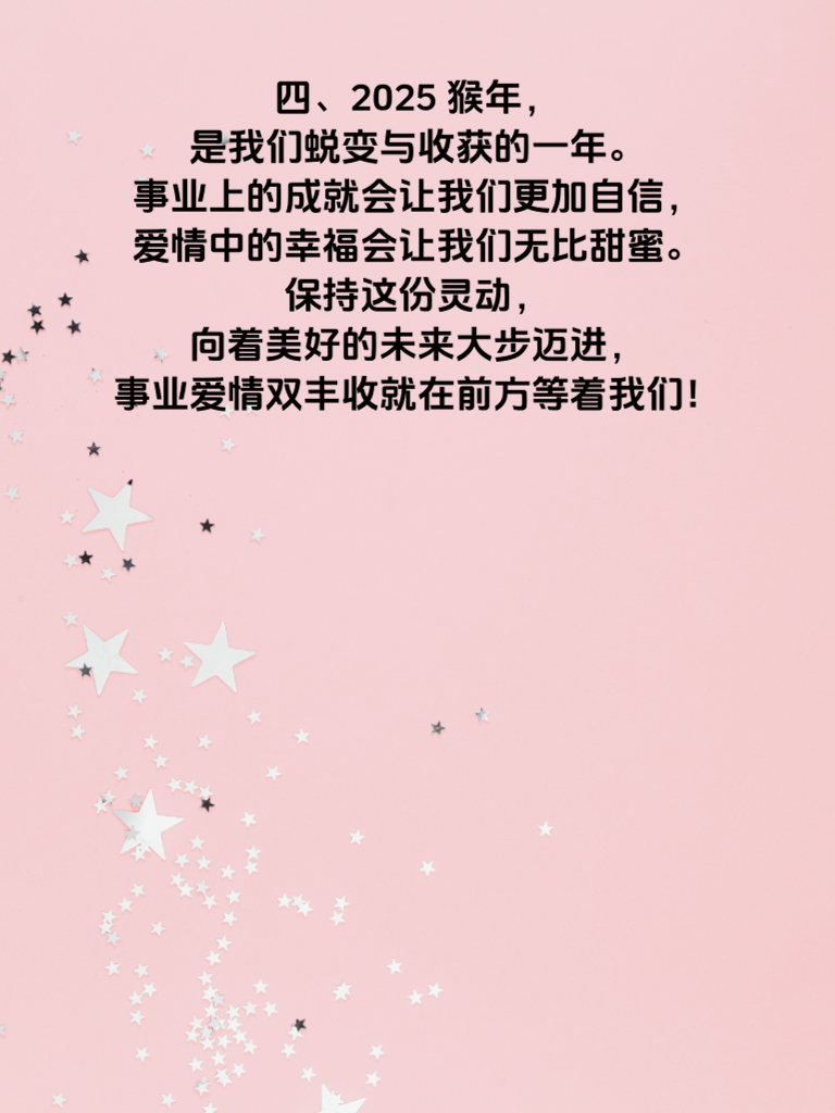 一、2025 年,猴年的钟声敲响,仿佛是命运的号角,预示着新的机遇与挑战。在这灵动的年份里,姑娘们,让我们以全新的姿态去拥抱生活,事业与爱情都将迎来丰收的喜悦。 二、事业上,猴年赋予我们机智与灵动。学会像猴子一样敏锐捕捉机会,勇敢展现自己的才华。每一次挑战都是成长的阶梯,每一次努力都在拉近与成功的距离。用智慧和汗水浇灌事业之花,它必将绽放绚烂光彩。 三、爱情方面,猴年带来的是活泼与热情。主动去结识那个特别的他,用你的灵动吸引他的目光。真诚地交流,用心去感受彼此的心意。在这个充满活力的年份里,大胆追求属于你的爱情,让甜蜜的故事就此展开。 四、2025 猴年,是我们蜕变与收获的一年。事业上的成就会让我们更加自信,爱情中的幸福会让我们无比甜蜜。保持这份灵动,向着美好的未来大步迈进,事业爱情双丰收就在前方等着我们!