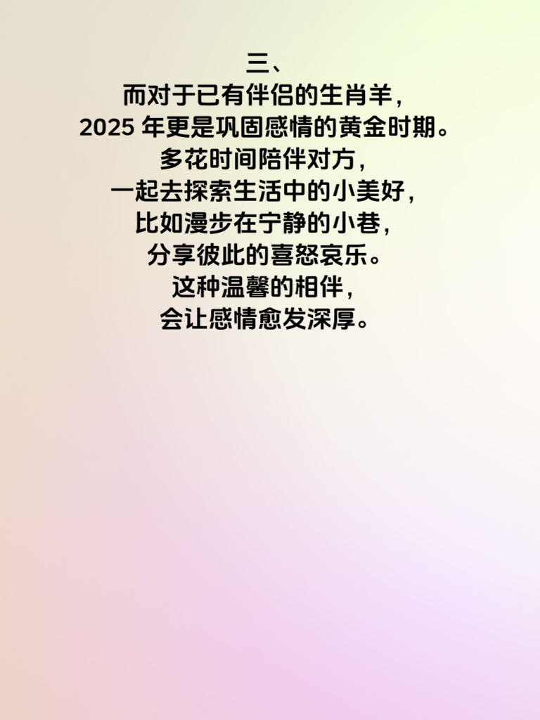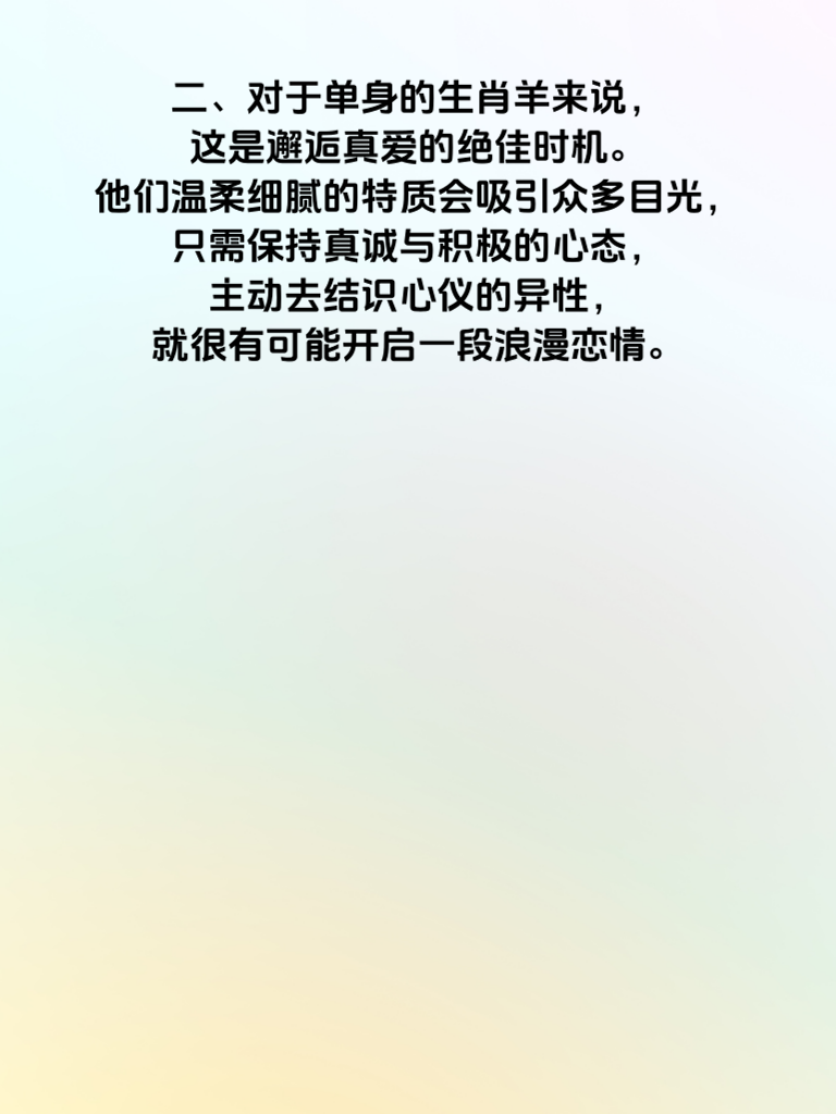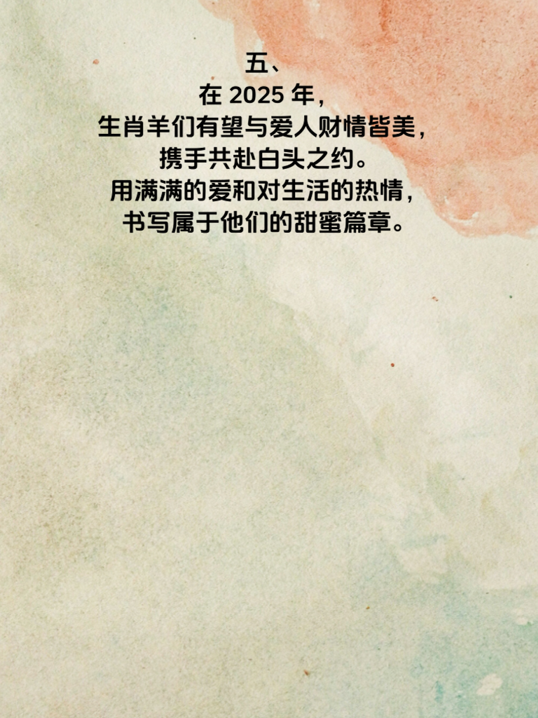 一、生肖羊的2025年,宛如一幅温馨的画卷正徐徐展开。在这一年里,他们的爱情运势格外迷人,仿佛有一股神秘的力量在牵引着美好的缘分降临。 二、对于单身的生肖羊来说,这是邂逅真爱的绝佳时机。他们温柔细腻的特质会吸引众多目光,只需保持真诚与积极的心态,主动去结识心仪的异性,就很有可能开启一段浪漫恋情。 三、而对于已有伴侣的生肖羊,2025年更是巩固感情的黄金时期。多花时间陪伴对方,一起去探索生活中的小美好,比如漫步在宁静的小巷,分享彼此的喜怒哀乐。这种温馨的相伴,会让感情愈发深厚。 四、在财富方面,生肖羊也有着不错的机遇。凭借自身的智慧与努力,能够收获一些意外之财。但要记得合理规划,让财富为生活增添更多的幸福。 五、在2025年,生肖羊们有望与爱人财情皆美,携手共赴白头之约。用满满的爱和对生活的热情,书写属于他们的甜蜜篇章。